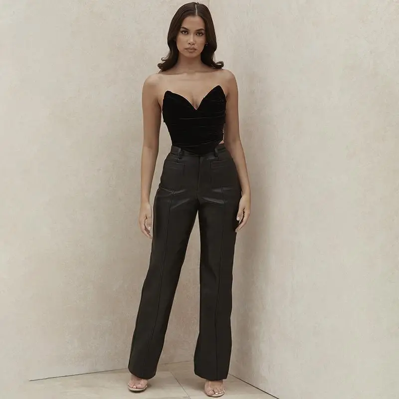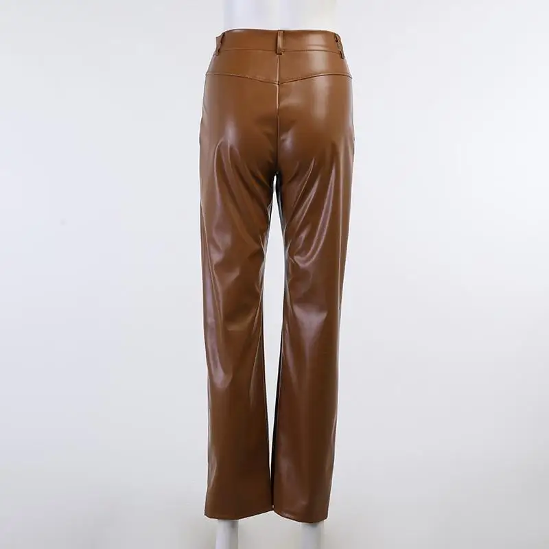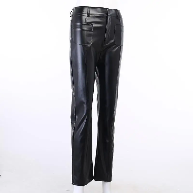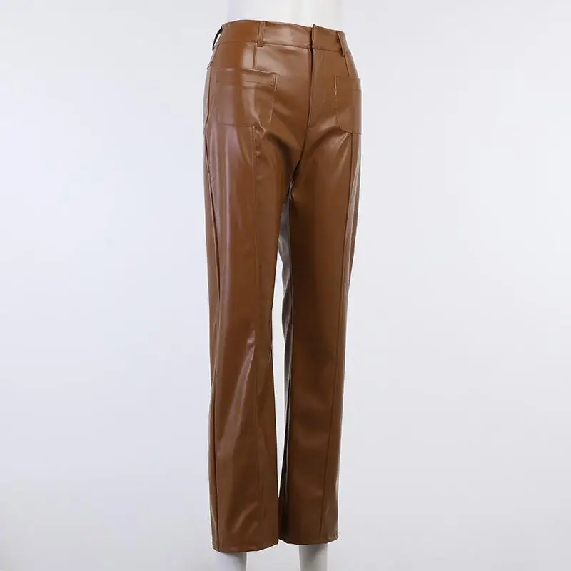 Женские прямые брюки из искусственной кожи, элегантные офисные винтажные Брюки с карманами и высокой талией для отдыха, размеры L, осень 2021