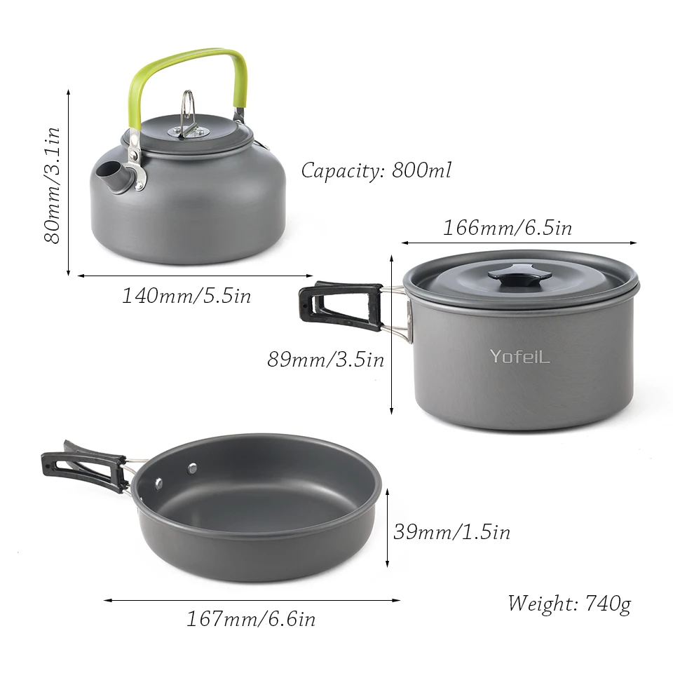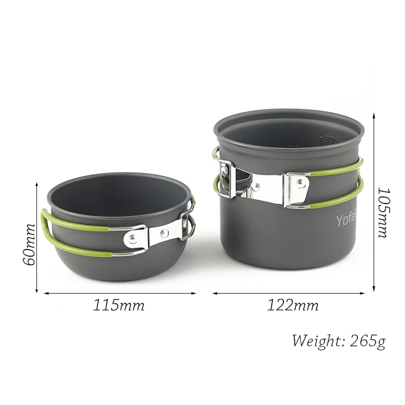 Настройка набора 11 большой горшок, 1 сковорода, чайник 1,6л, 4 миски, 2 набора складных ножей, вилок, ложек, 1 лопата, 1 столовая ложка, 1 чистящий шарВес: 1100 гПодходит для 4-5 человекНабор 2 конфигурации1 большой горшок, 1 сковорода, 0.8л чайник, 2 складные чашки, 1 набор складных столовых приборов, 1 карабинВес: 900 гПодходит для 2-3 человекНабор 3 конфигурации1 маленький горшок, 1 маленькая сковорода, 1 Складная чашка, 1 складной нож, вилка и ложка, 1 карабинВес: 450 гПодходит для 1-2 человек