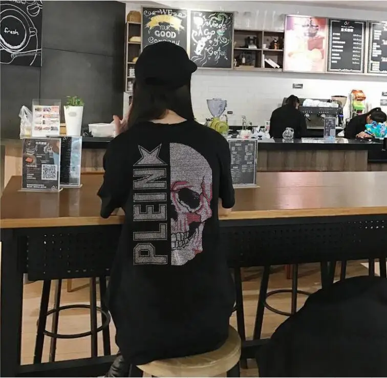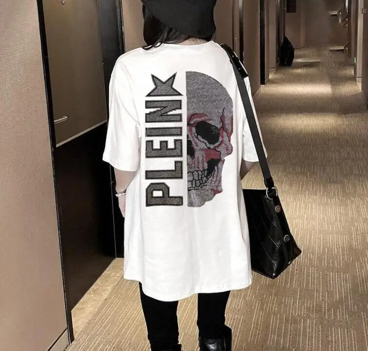 Футболка женская с черепом, Повседневная Свободная рубашка с коротким рукавом, уличная одежда для девушек, стразы, на лето