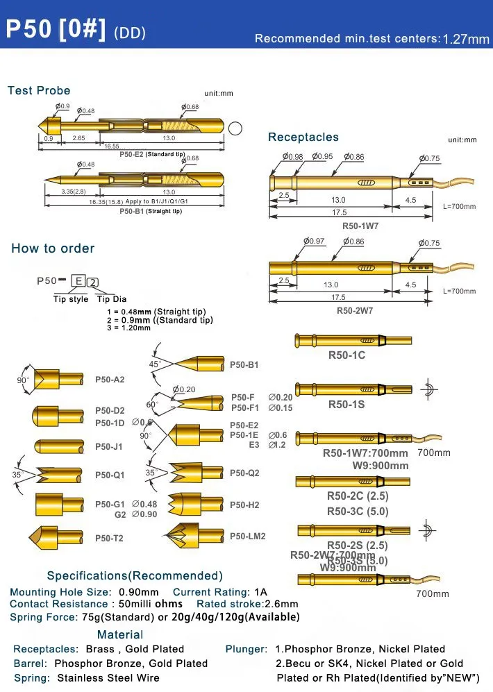 100 шт.упак. R50-2C Весна Тесты Pin строчка на рукавах 0,86 мм стопорное кольцо Высота 2,5 мм щуп иглы сиденье