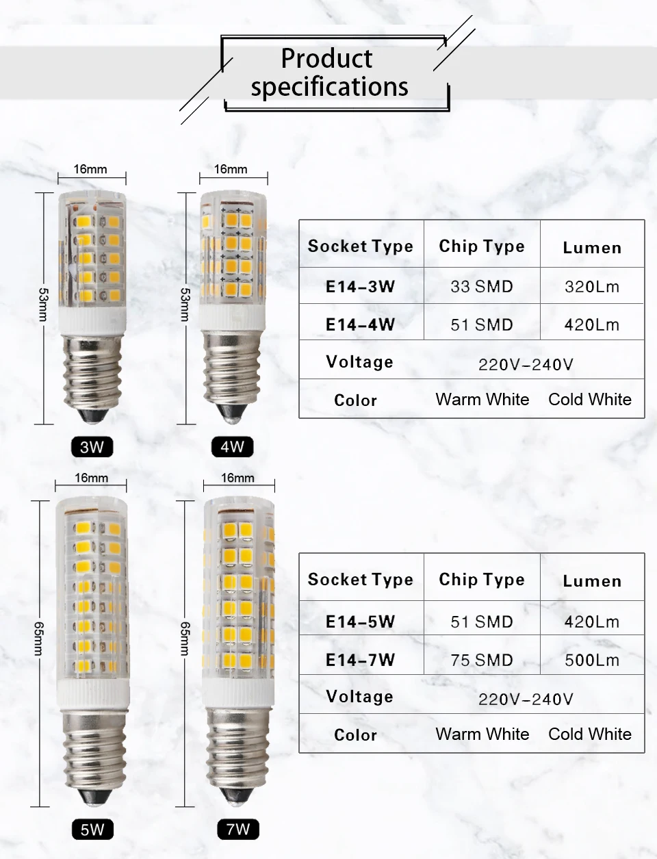 Светодиодная керамическая лампа E14, 10 шт.лот, 220 В переменного тока, 230 В, 240 В, 3 Вт, 4 Вт, 5 Вт, 7 Вт, 2835 SMD, светодиодная лампа-кукуруза, светодиодный прожектор с углом поворота 360 градусов