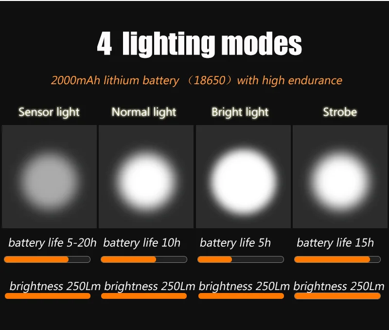 Senor яркий/Нормальный/яркий/Strobe2000mAh литиевая батарея (18650) с 250 люмен.