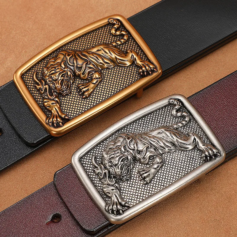 Ремень мужской из натуральной коровьей кожи, с гладкой пряжкой в виде тигра, серебристого и золотистого цветов, размера плюс, 105, 110, 120, 130, 140, 150 см