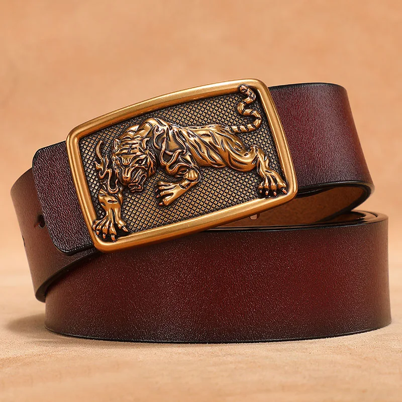 Ремень мужской из коровьей кожи, с металлической пряжкой в виде тиг...