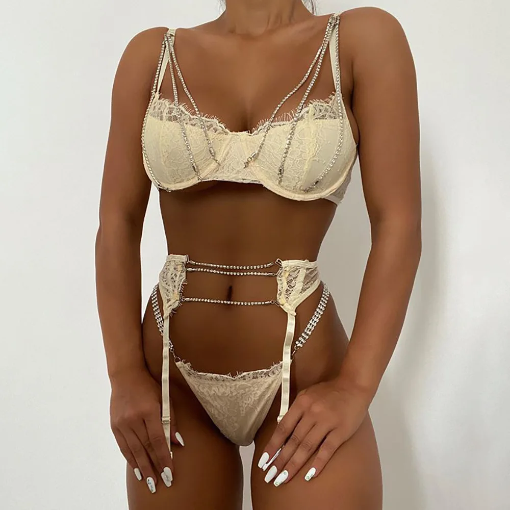 Комплект женского кружевного нижнего белья с блестящими кристаллами