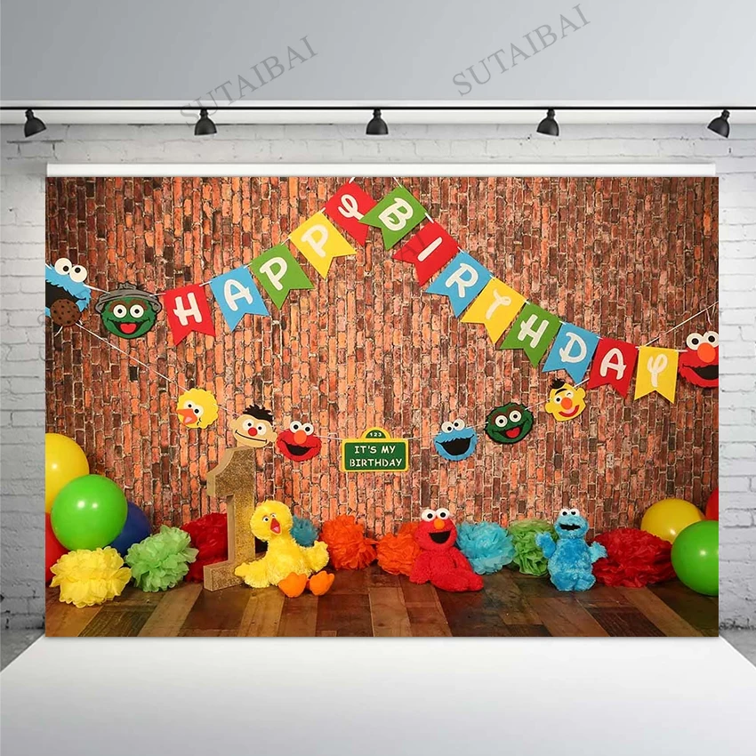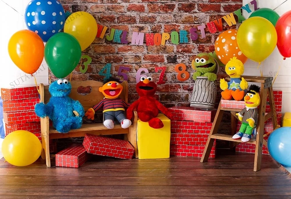 Фон для фотосъемки мальчиков на 1-й день рождения, Улица Сезам, игрушки, кирпичи, стены