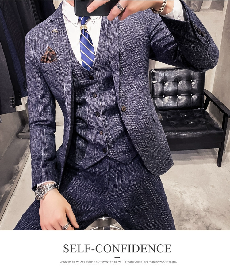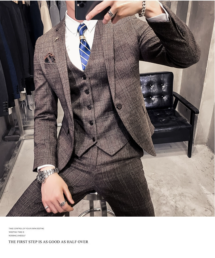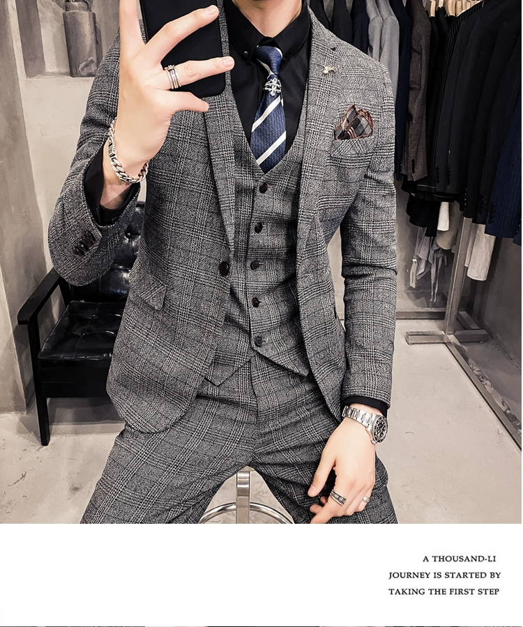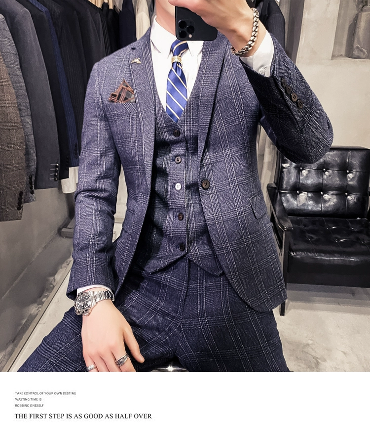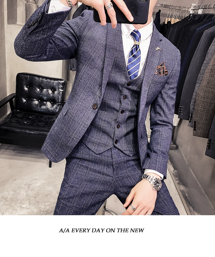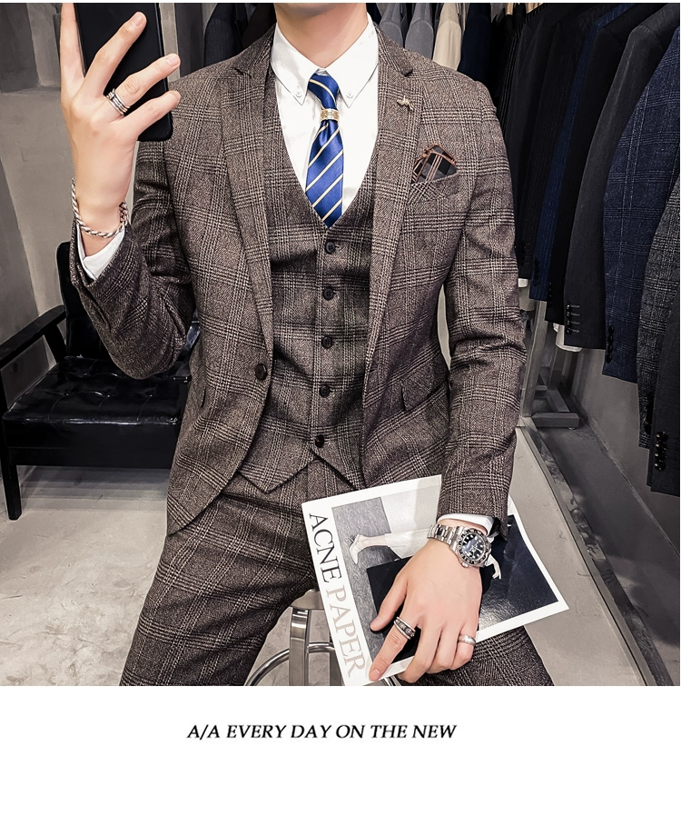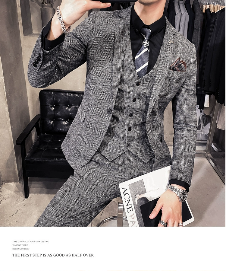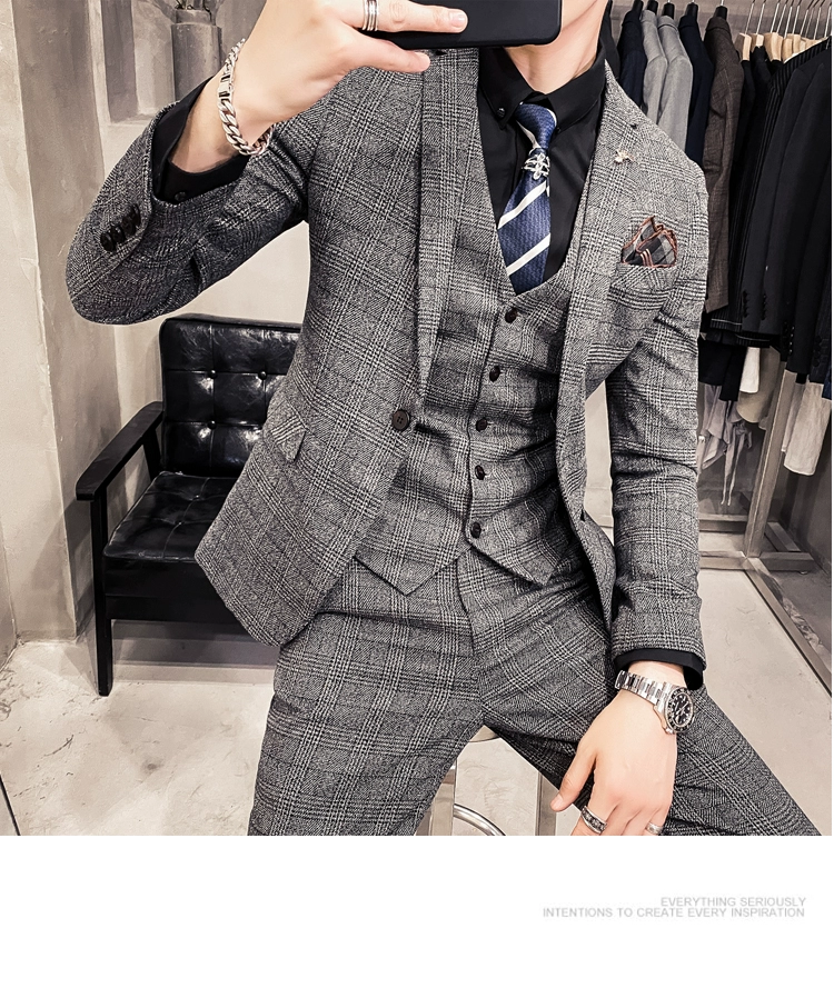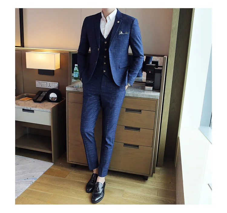 Мужские корейские блейзеры 6XL 7XL (куртки + жилет + брюки), облегающий Британский деловой костюм в клетку, мужское свадебное платье для жениха из трех предметов