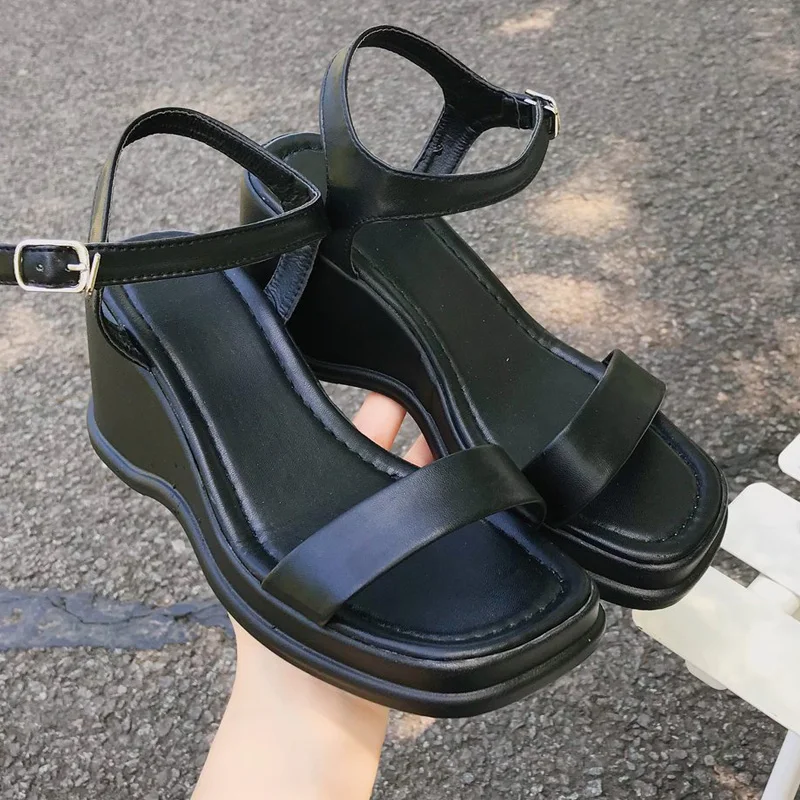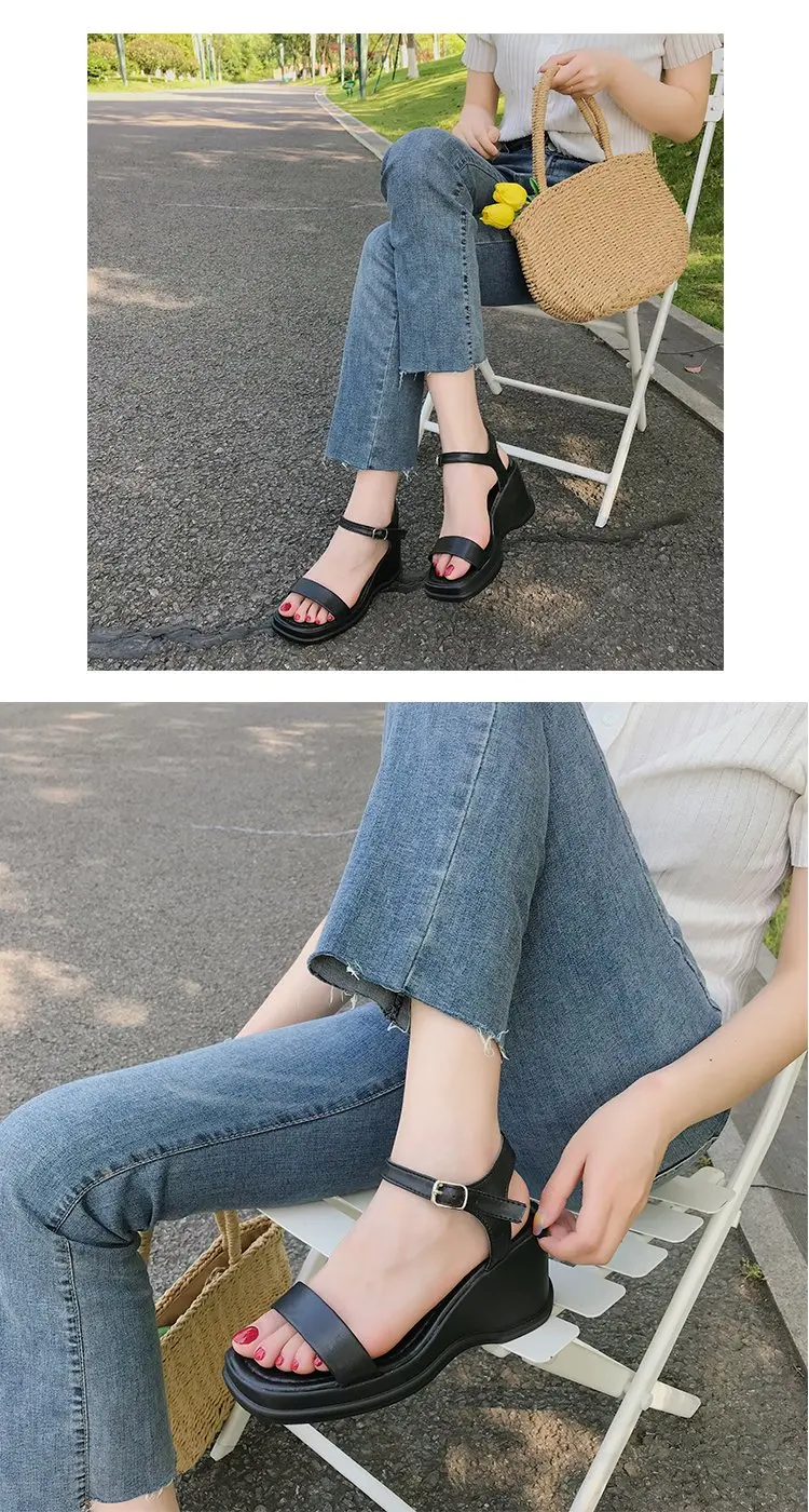 Новинка; Женские босоножки без застежки с узкими ремешками; Цвет черный, белый, зеленый; Пляжные сандалии; Коллекция 2021 года; Женские кожаные высокие сандалии на танкетке; Сезон лето
