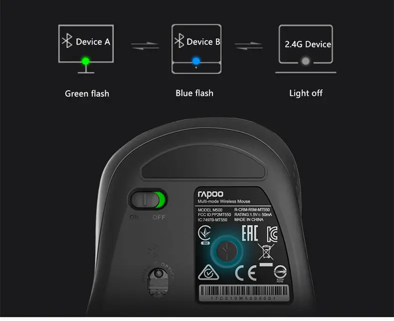 Модель 2,4G1. Подключите приемник Rapoo.2. Включите мышь. Совместимая с Bluetooth модельО: сопряжение первого устройстваA1.включите мышьA2.удерживайте нажатие кнопки, совместимой с Bluetooth, по крайней мере 3 секунды для сопряжения.Светодиодный индикатор состояния медленно мигает зеленым. Мышь обнаруживается в течение 2 минут.A3.полное соединение с Bluetooth на вашем устройстве:Windows 7 и 8:(1) Нажмите кнопку «Пуск», затем выберите Панель управления> Добавить устройство.(2) выберите «Rapoo BT3.0 Mouse» или «Rapoo Ble Mouse» из списка, затем нажмите next. Windows 10:(1) Нажмите кнопку «Пуск», затем выберите Настройки> устройства> Bluetooth.(2) выберите «Rapoo BT3.0 Mouse» или «Rapoo Ble Mouse» из списка, затем нажмите Pair.Когда мышь и устройство соединены, светильник выключается. B: сопряжение второго устройстваB1.нажмите кнопку переключения, чтобы переключиться на другой канал.Удерживайте нажатие кнопки Bluetooth не менее 3 секунд для сопряжения.Светодиодный индикатор состояния медленно мигает синим. Мышь обнаруживается в течение 2 минут.B2.выполните шаг a3 «сопряжение первого устройства» для завершения сопряжения Bluetooth. Светодиодный статусКогда вы берете мышьЕсли светильник станет стабильным зеленым в течение 6 секунд, совместимое с Bluetooth устройство 1 сопряжено.Если светильник в течение 6 секунд становится стабильным синим, совместимое с Bluetooth устройство 2 сопряжено.Если светильник выключен, 2,4 ГГц устройство работает в паре. Переключение между парными устройствамиКогда вы Переключитесь на 2,4 ГГц устройства, статус светодиодный выключен.При переключении на bluetooth-устройство 1 или 2 зеленый или синий светильник быстро мигает соответственно. Низкая батареяЗеленый светильник мигает дважды каждые две секунды при использовании мыши. Системные требованияWindows XP/Visa/7/8/10 или более поздние версии, MacOS ГарантияУстройство имеет ограниченную гарантию на один год с момента покупки.Часто задаваемые вопросы:Устройство не работает?1. Убедитесь, что устройство включено.2. Убедитесь, что приемник подключен к usb-порту ПК.3. ПК не может распознать приемник, пожалуйста, повторно подключите приемник.4. Проверьте, правильно ли установлен аккумулятор и повторно установите аккумулятор.5. Если проблема не была решена, загрузите парную программу с http://www.rapoo.cn/downloadcenter, затем отремонтируйте соединение.6. Пожалуйста, свяжитесь с нами, если вы не можете решить проблему или вы хотите задать какие-либо проблемы, мы постараемся ответить вам в течение 24 часов.Как загрузить программное обеспечение для сопряжения нескольких моделей с Rapoo webside?Нажмите (http://www.rapoo.cn/downloadcenter)Как сопрягать мышь с помощью программного обеспечения?Сопряжение мыши:Примечание:А. Убедитесь, что USB порт ПК работает;B. При сопряжении мыши, пожалуйста, держите беспроводной приемник и компьютер и мышь расстояние в пределах 5-10 см! Очень важно.C. При подключении мыши rapoo перемещайте другую беспроводную мышь и приемник.Шаги пары:1. Приемник подключается к usb-порту компьютера, затем откройте программное обеспечение сопряжения, следуйте инструкциям программного обеспечения.2. Выключите выключатель питания мыши или удалите аккумулятор.3. Используйте проводное использование mo или тачпад для ноутбука, чтобы нажать кнопку Pair. (очень важно)4. Затем Вставьте батарею и включите мышь быстро, затем нажмите мышку влево и вправо три кнопки одновременно, пока сопряжение не завершится ил