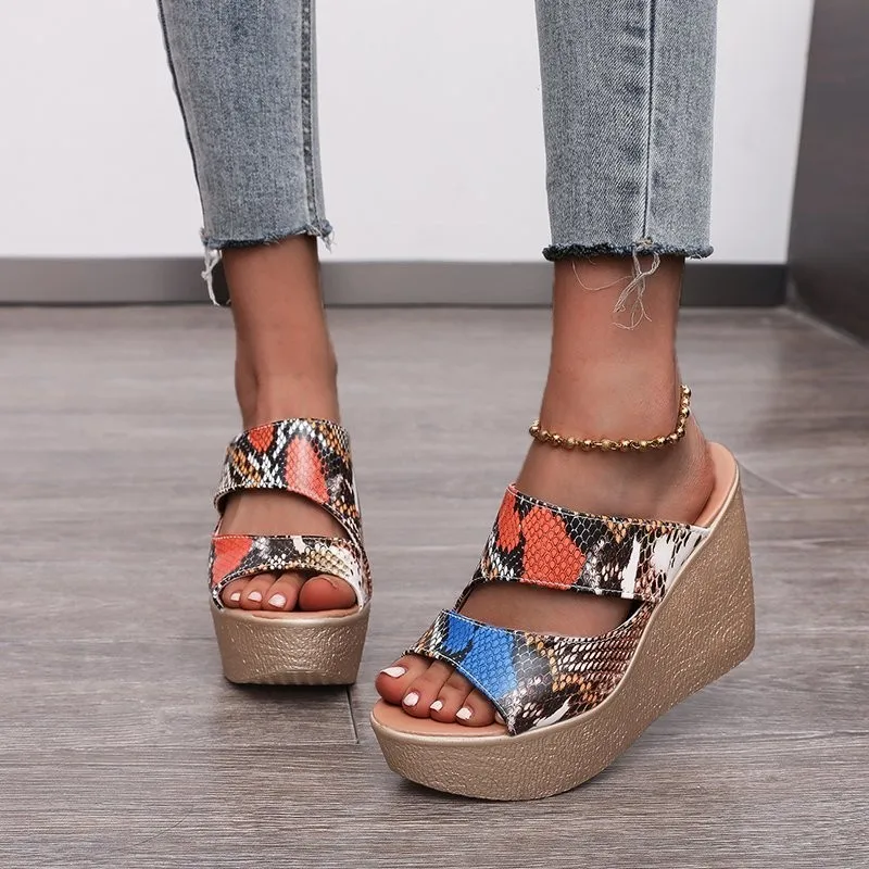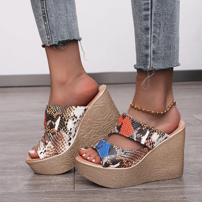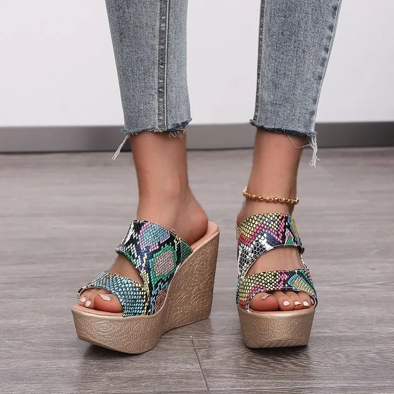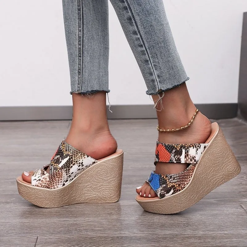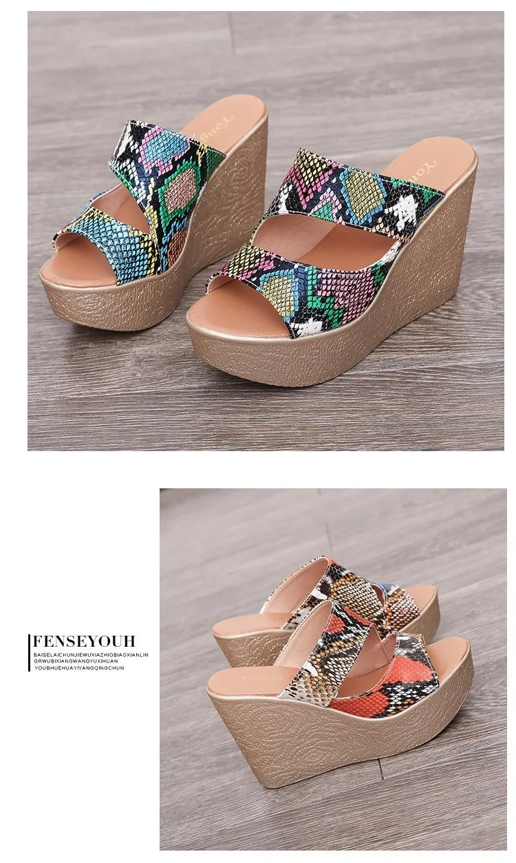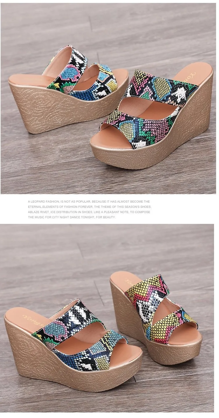 Сандалии женские на танкетке со змеиным принтом, Модные Босоножки с открытым носком, дышащая пляжная обувь на толстой подошве, летние Тапочки