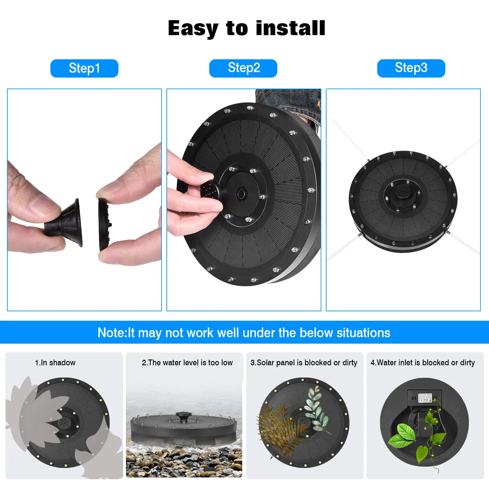 Особенности:1. Хранить электричество для длительного времени светильник шт/набор: это новая Обновленная версия фонтан на солнечной батарее. В течение дня на солнце, он может распылять воду более мощно, чем любые другие фонтаны на рынке. Он имеет встроенный высокопроизводительный полимерный литиевый аккумулятор с функцией питания. Вода может распыляться в пасмурные дни, а цветной светодиодный фонтан может работать непрерывно в течение 5 часов ночью, когда аккумулятор полностью заряжен.2. Сад бассейн украшения: Этот красочный светодиодный светильник оснащен 24 светодиодный светильник s. При обнаружении наступающей ночи светильник будет включать три цвета (красный, зеленый и синий), что сделает бассейн в саду более роскошным ночью. Со встроенным высокопроизводительным полимерным литиевым аккумулятором, Солнечный фонтан птичьего гнезда может автоматически работать под прямыми солнечными лучами всего за 3 секунды, а высота распыления может достигать более 30-60 см, будь то Облачно или солнечно. Он может работать в течение 5 часов без электричества или аккумулятора.3,7 видов распыления: с 7 различных типов насадка, прикрепленный, есть семь видов распыления с различными воды формы и высоты. Простая установка, не требуется провод, не требуются вилки и дополнительный насос. Легко перемещается в разные места. На солнечной энергии, без батареи или электричества. Он работает автоматически под солнцем с высокой эффективностью и защитой окружающей среды.4. Усовершенствованная технология: фонтан для хранения солнечной энергии-это устройство для ландшафтного фонтана. Он использует солнечные панели для зарядки аккумулятора, а затем производит энергию для водяного насоса. С высокоэффективными солнечными панелями и новым типом бесщеточного водяного насоса, этот фонтан имеет преимущества быстрого запуска, высокой эффективности и сильной стабильности. Он может непрерывно производить водный цветок для вашего сада. Легко чистить и поддерживать.5. Конструкция панели защиты от столкновений: изделие оснащено четырьмя решетками для предотвращения столкновений, который может быть использован для фиксации фонтана в одном положении и предотвращения попадания фонтана на край бассейна, в результате чего вода выливается.6. Встроенная функция защиты от нехватки воды (мониторинг уровня воды): благодаря встроенному контролю уровня воды, он может автоматически прекращать работу при нехватке воды, И он может начинаться сразу же при добавлении воды без перезапуска или активации. Он прост в эксплуатации и позволяет избежать попадания насоса на холостом ходу, что может уменьшить срок службы насоса.7. Новый тип солнечного Фонтана имеет два режима работы: дневной и ночной режим работы. В день светильник выключен без распыления воды; В ночное время светильник включен с распылением воды. Этот новый тип фонтана солнечного насоса очень подходит для птиц, аквариумов, небольших прудов, бассейнов, садов, террас, газонов и циркуляции кислорода. Его можно использовать в качестве фонтана днем, а также как фонтанный декоративный ландшафтный светильник ночью, который может принести вам больше радости.Спецификация:Напряжение солнечной панели: 9 ВМощность панели солнечных элементов: 3,5 WВстроенная литиевая батарея: 3,7 V/2000mAhМаксимальный поток насоса: 180 л/чТоп-Лифт: 