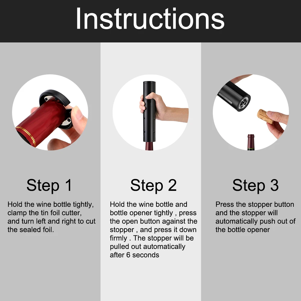 1. Простота использования: Простое управление кнопкой, нажмите кнопку «вниз», чтобы извлечь пробку из бутылки,