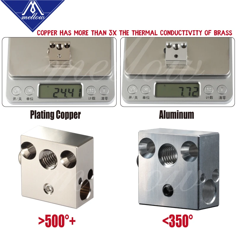 Медь имеет более 3х теплопроводность латуни, и медный сплав был покрыт для устранения окисления, которое происходит в меди при высоких температурах. Небольшой побочный эффект заключается в том, что высокая тепловая масса меди также увеличит время нагрева, но обеспечит более жесткий контроль температуры. Этот медный сплав очень устойчив к температурам и не начнет смягчать или отжигать до более 500 °C. Идеально подходит для высокотемпературной печати, с которой алюминиевый обогреватель не справляется.