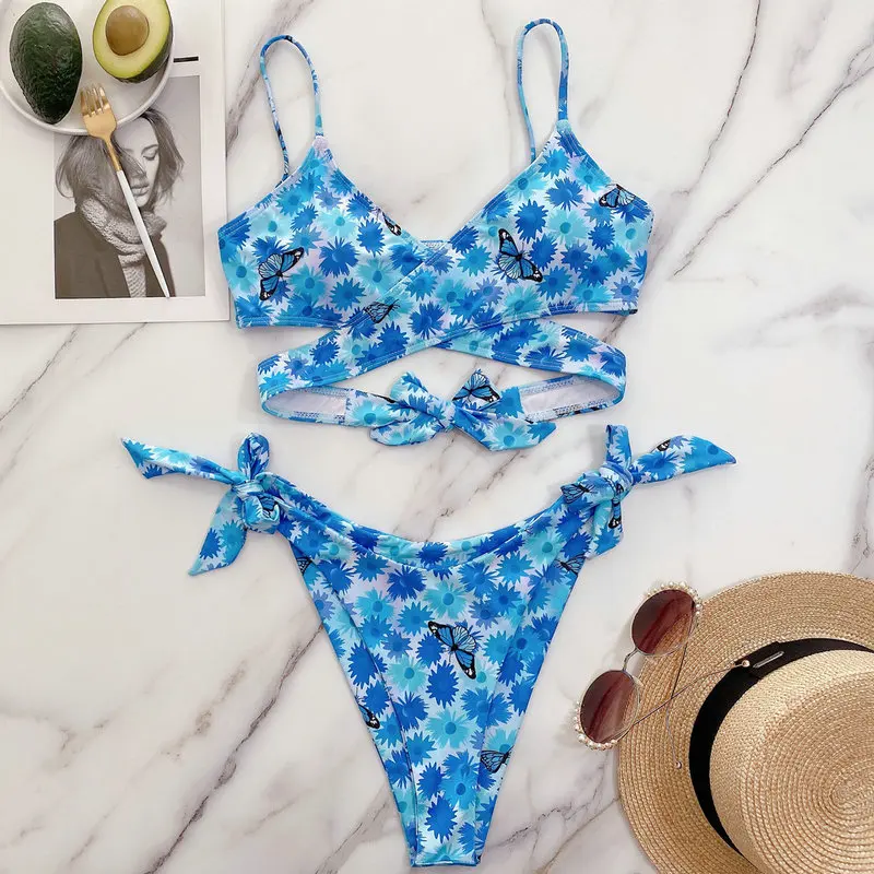 Женский купальный костюм QINJOYER, из 2 предметов, бандажный синий купальник с цветочным принтом, бикини с V-образным вырезом и бретелькой на шее, 2021