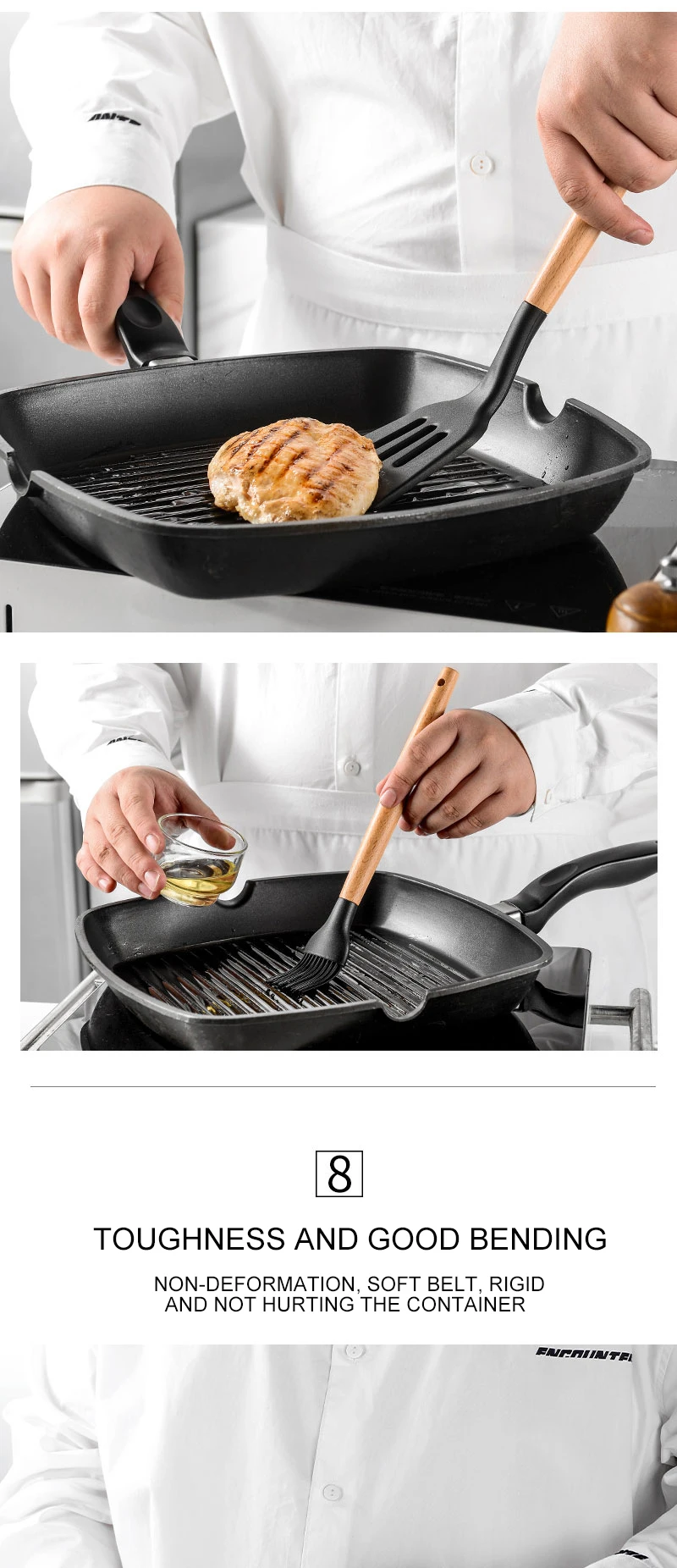 3. Силиконовую посуду с деревянными ручками нельзя использовать в посудомоечных машинах. После волдырей тепловое расширение и сжатие будут серьезными.