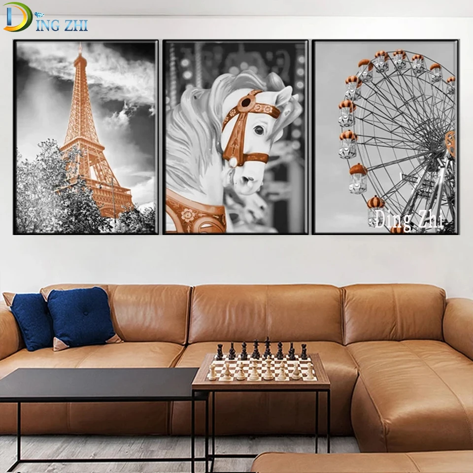 DIY алмазная живопись 5D черный белый пейзаж, колесо обозрения, башня белая лошадь Алмазная вышивка скандинавские животные мозаика домашний декор