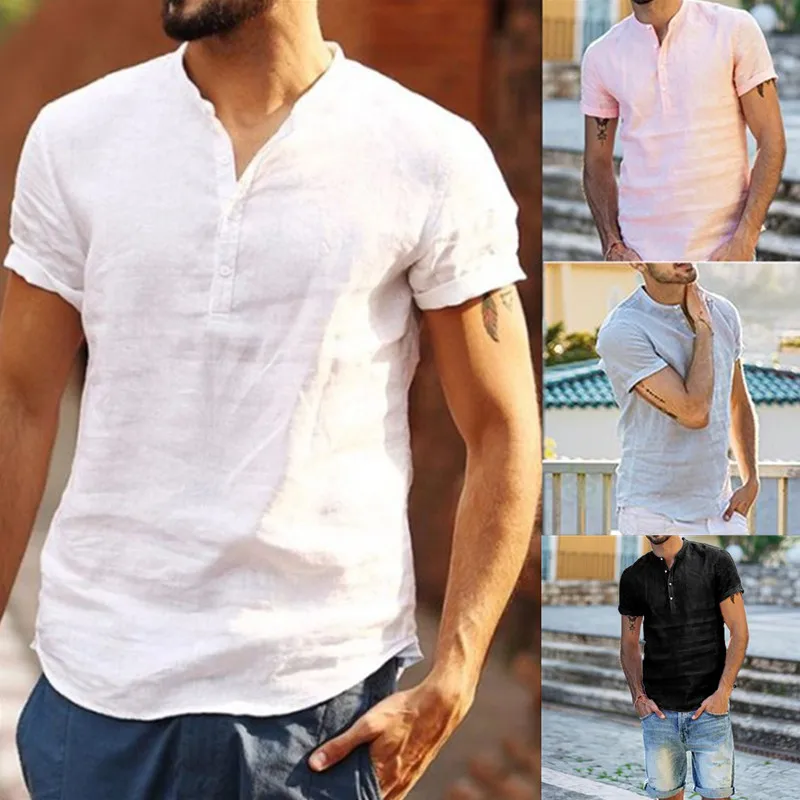 Летние мужские льняные футболки с коротким рукавом и V-образным вырезом, дышащие однотонные Мешковатые повседневные приталенные хлопковые топы, пуловеры, мужские льняные рубашки