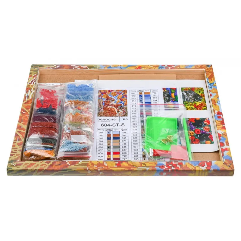 Основа работы – холст с напечатанной цветной схемой и контрастными условными обозначениями. Схему покрывает высококачественный клеевой слой, который сверху закрыт защитной плёнкой для предотвращения высыхания клея.Комплект ярких искусственных камней на основе эпоксидной смолы расфасован по цветам в маленькие пакетики, на каждом из них имеется наклейка с номером цвета и условным обозначением.