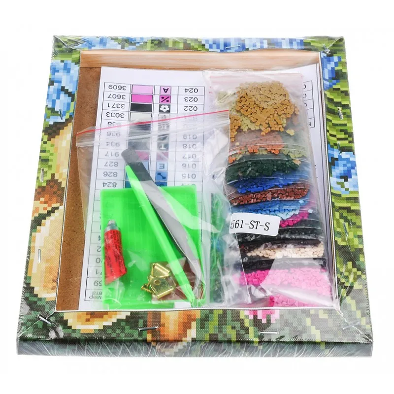 В наборе вы найдёте всё необходимое для вашей работы! Разноцветные камешки представлены двумя типами, 9 и 13 граней, снизу плоские, а верх огранён по типу драгоценных камней. Просто заполняйте ими схему на холсте, и вы убедитесь, как это легко и увлекательно!