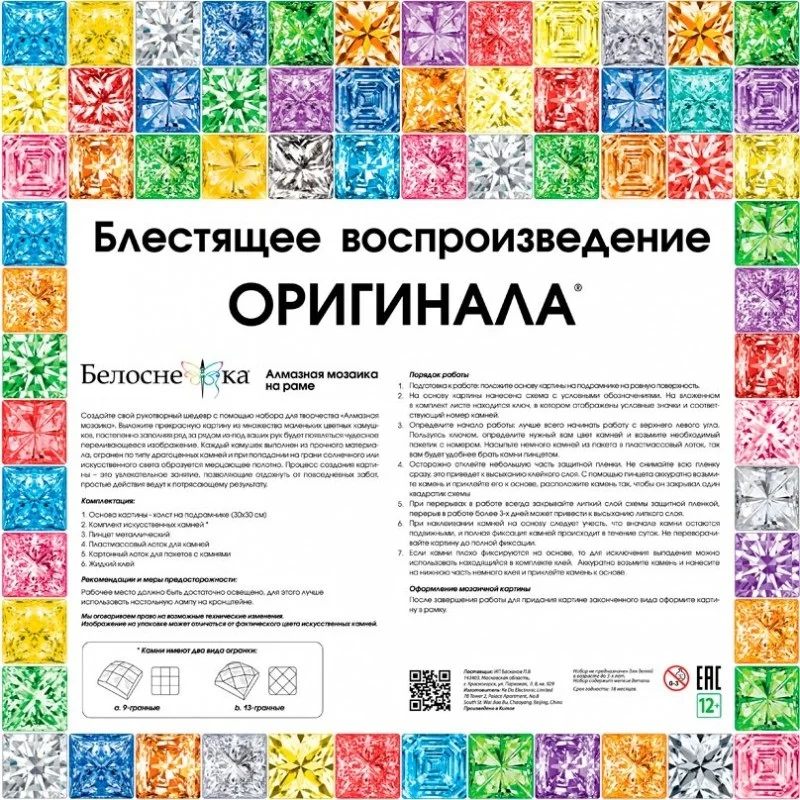 Для вас мы подготовили всё самое необходимое: холст с цветной схемой и условными обозначениями, набор квадратных акриловых камней двух типов - 9 и 13 граней, металлический пинцет и лоток для камешков с низкими бортиками, пластмассовый карандаш с силиконовой клеевой подушкой и ключ к схеме. Холст натянут на подрамник, усиленный листом оргалита. В процессе работы над картиной вы можете выбрать, чем вам удобнее выкладывать: пинцетом или карандашиком.