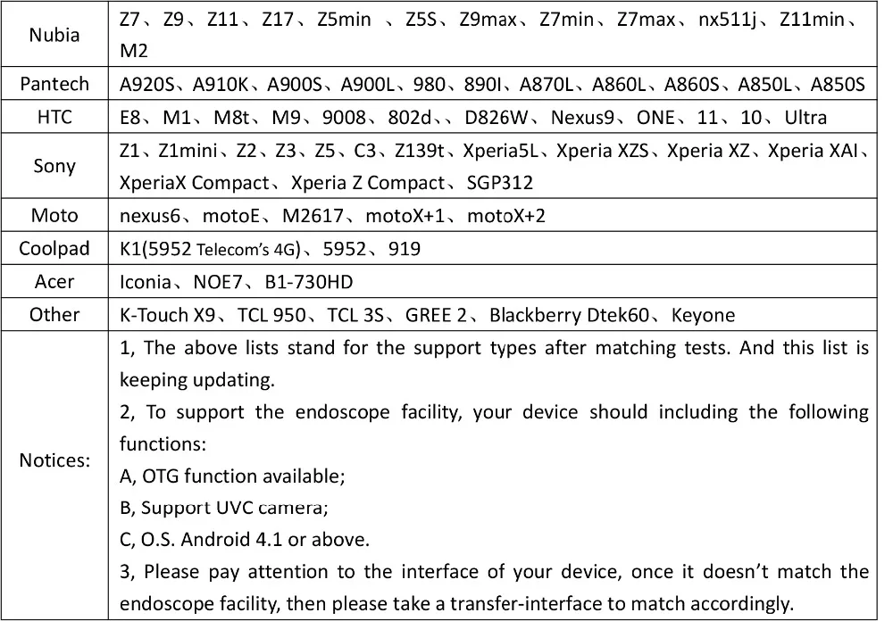 Клиенты, которые хотят приобрести этот товар, пожалуйста, дважды проверьте форму ниже, так как многие модели не поддерживаются, кроме телефонов в этой форме. Если ваш телефон не в форме ниже, пожалуйста, купите WIFI эндоскоп.