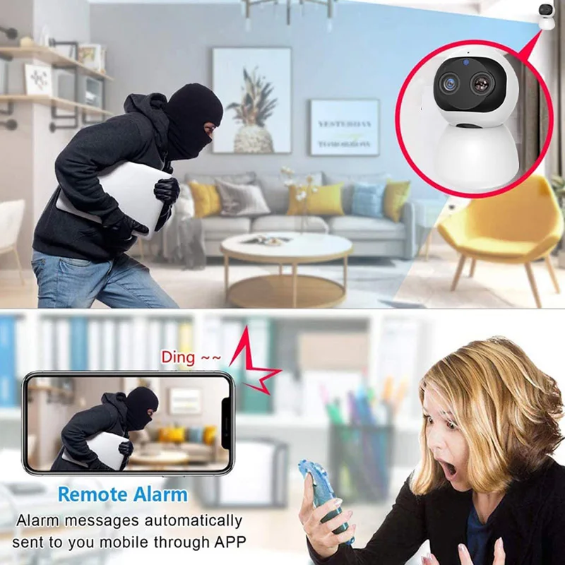 【 1080P HD WiFi ip-камера 】предназначена для внутренней безопасности с 2*1080P HD объективом (один для широкоугольного и один для длинного зума), все захваченные этой камерой будут представлены вам с помощью бесплатных видео. (Примечание: камера работает с Wi-Fi 2,4G, не поддерживает 5G сети)