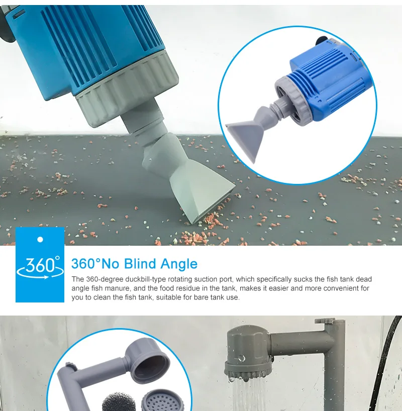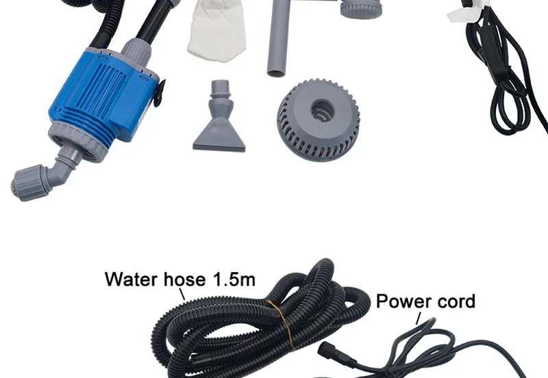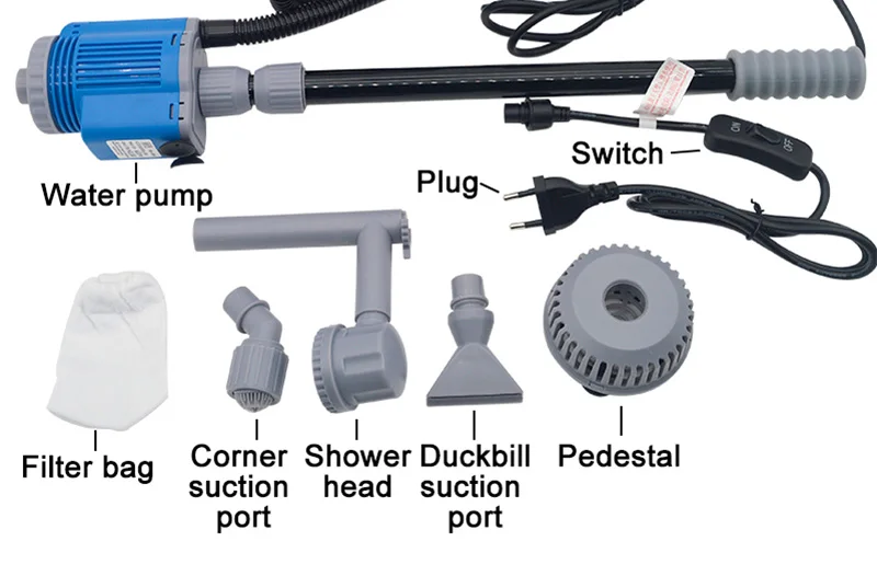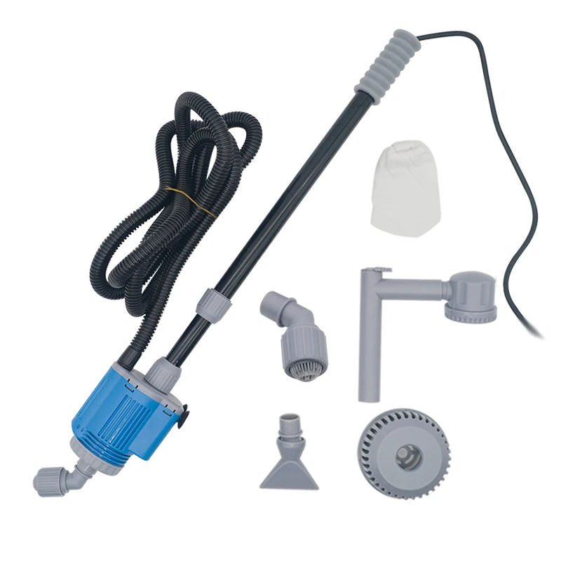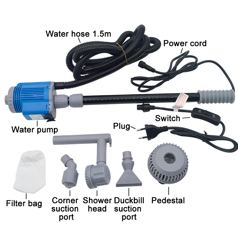 Essential for aquariums thanks to its adjustable power and versatility,its extendable handle makes it very manageable in large and small aquariums.Its water evacuation tube is suitable for not spilling any water.The amount of water left in the aquarium is minimal.The length of the electrical wiring is optimal to work in a quiet way.Its many accessories make cleaning quick and effective.The motor is powerful and silent,capable of raising the water to almost 2 meters.The cable switch makes it more useful.The adjustable pressure shower is great to oxygenate the aquarium and with the pedestal it will not move from its place.It can be used to draw water out of the aquarium and to refill it.The cleaning of the bottom is simple together with the nozzle that prevents the passage of gravel,the waste bag is effective in its task.The materials are resistant. It takes up little space when storing.I no longer have to use secondary pumps to drain the water,without worrying about harming the fish.