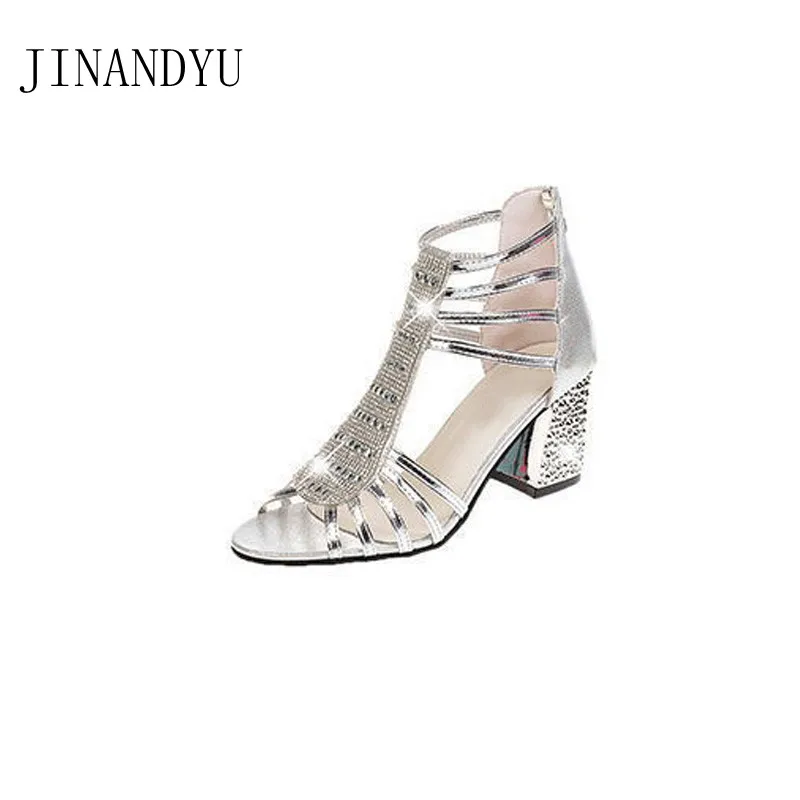Стразы, сандалии-гладиаторы на высоком каблуке, женская обувь на высоком каблуке, открытые, серебристые, золотистые сандалии на высоком каблуке, Модные женские босоножки на блочном каблуке