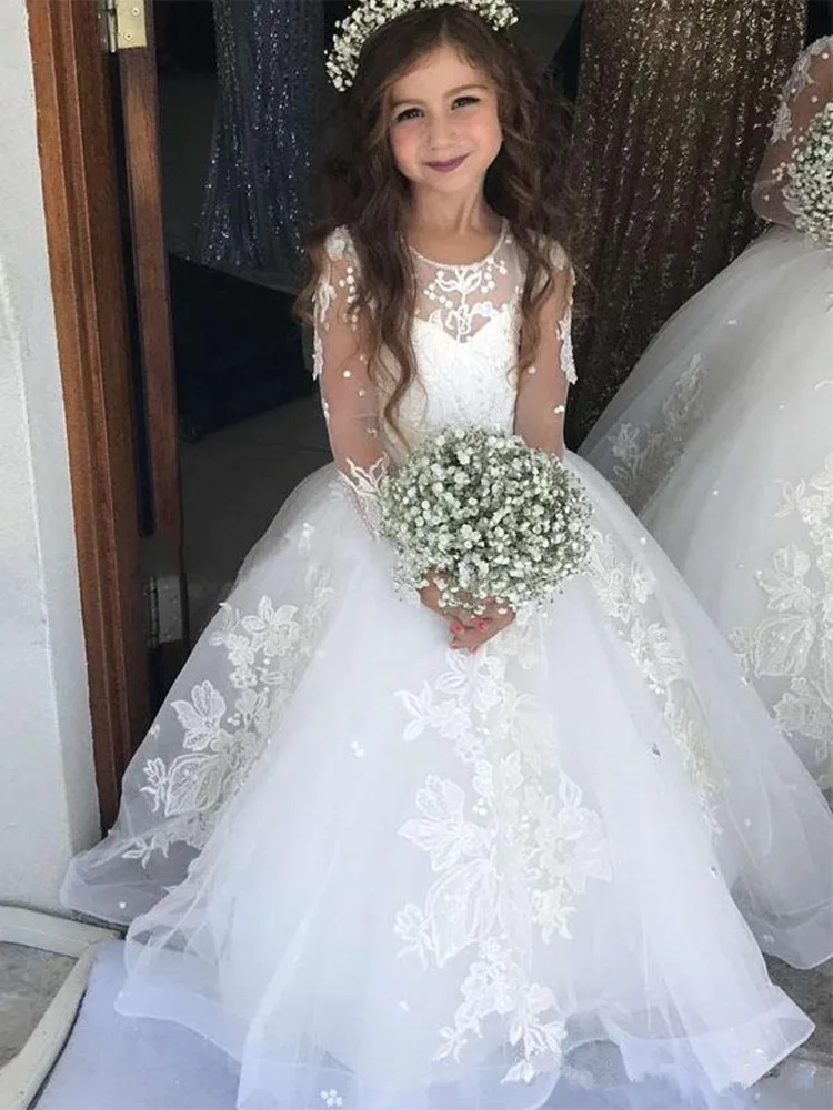 Белое платье для девочек с цветочным принтом для свадебной вечеринки платья с высоким воротом для крещения тюлевые платья с длинным рукавом Аппликации детское платье для святой причастия