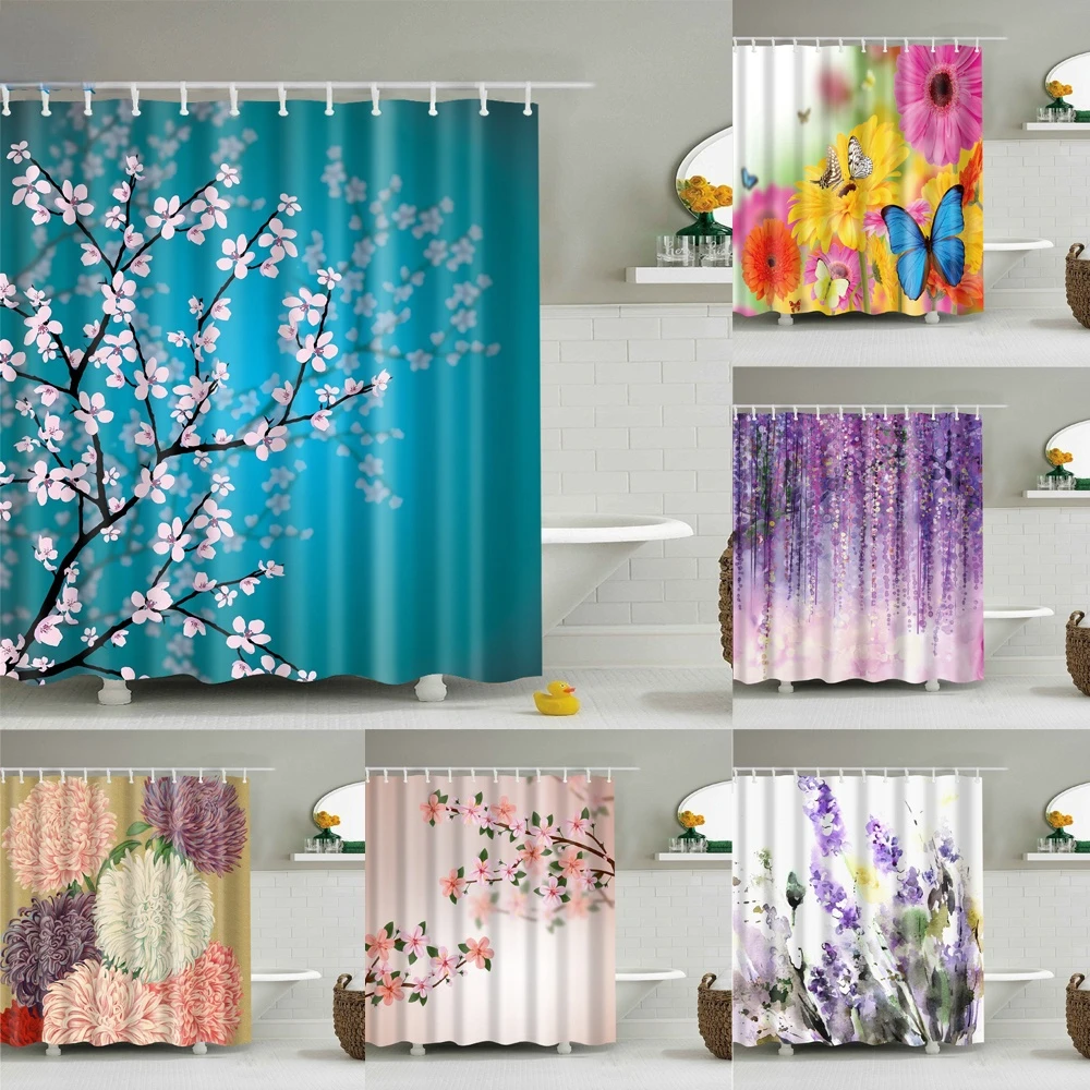 Занавеска для душа с цветами сливы, лотос, лаванда, роза, занавеска для ванной комнаты, водонепроницаемая занавеска для ванной из полиэстера с крючками