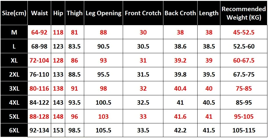 Размер (см)ТалияБедраБедроОткрытие ногПередняя промежностьЗадний кротДлинаРекомендуемый вес (кг)М64-92118818830383845-52,5L68-9812383,590,530,538,638,552,5-60XL72-10412886933139,23960-67,52XL76-11013388,595,531,539,839,567,5-753XL80-11613891983240,44075-854XL84-12214393,5100,532,54140,585-955XL88-128148961033341,64195-1056XL92-13415398,5105,533,542,241,5105-115