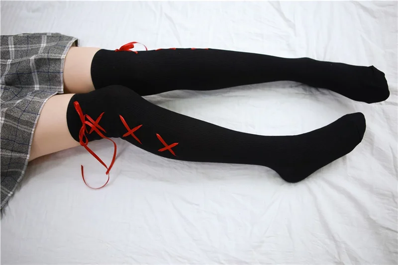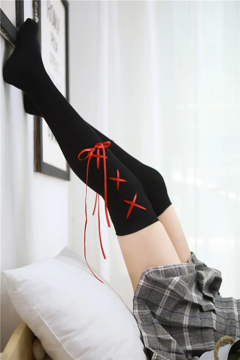 Женские чулки в стиле "Лолита", весенние японские Леггинсы, милые носки в стиле аниме для девочек, черные, белые чулки выше колена с перекрестной лентой, носки для косплея