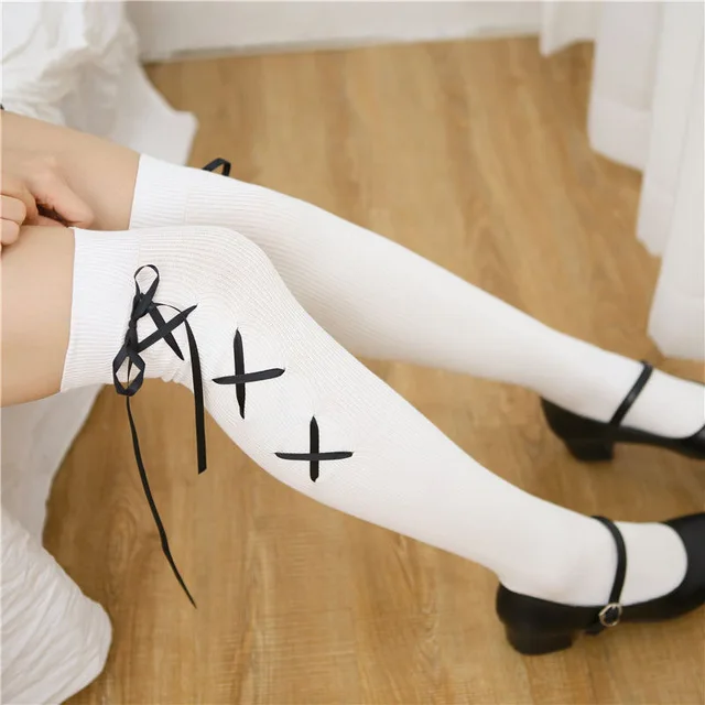 Женские чулки в стиле Лолиты; Весенние японские Леггинсы; Kawaii; Аниме; Носки для девочек; Цвет черный, белый; Чулки выше колена; Носки с перекрестными лентами для костюмированной вечеринки