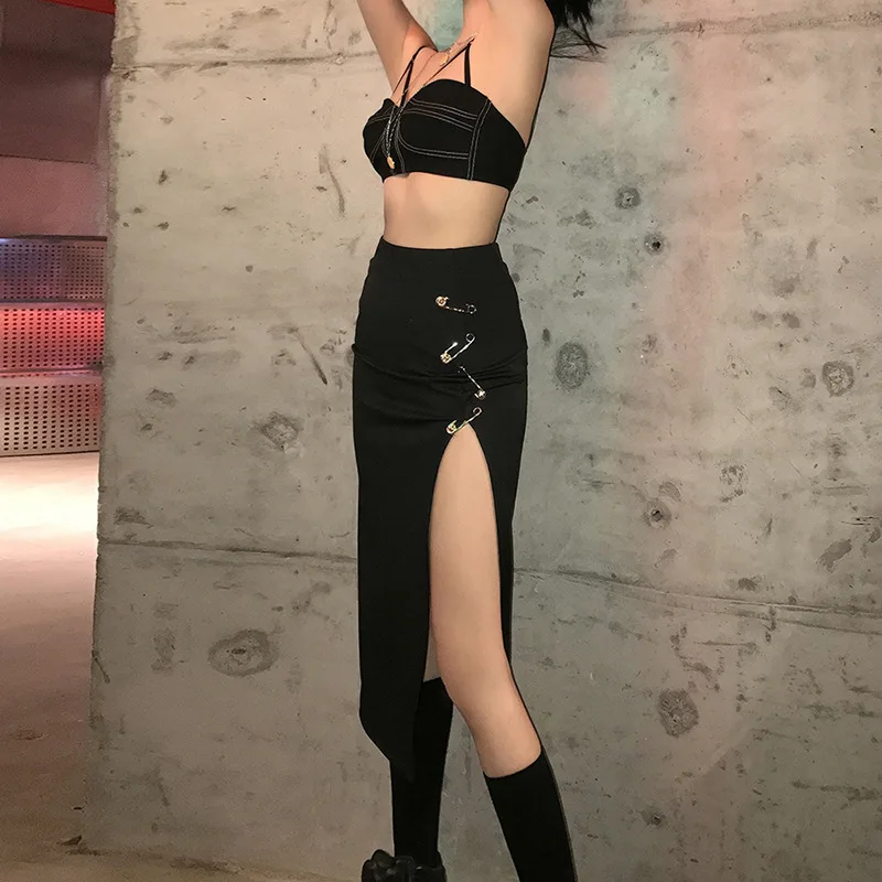 Женская длинная юбка средней длины, черная облегающая юбка с высокой талией и разрезом, украшенная булавками, в европейском и американском стиле, лето 2021
