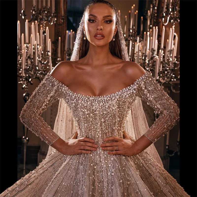 Роскошные свадебные платья с украшением в виде кристаллов Свадебные платья с жемчугом блеск Дубай одежда с длинным рукавом с открытыми плечами Robe de marie индивидуальный заказ