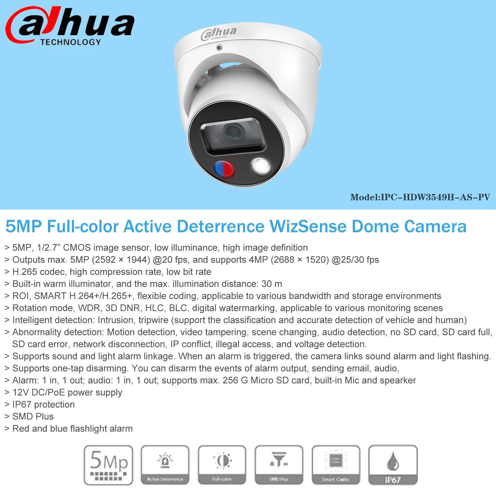 1. Эта камера представляет собой новый тип камеры Dahua, которая поддерживает связь звукового сигнала и светильник с сигнализацией, чтобы отпугивать нарушителей (Интеллектуальное обнаружение: вторжение, отключение, обнаружение движения,Изменение сцены, обнаружение звука)