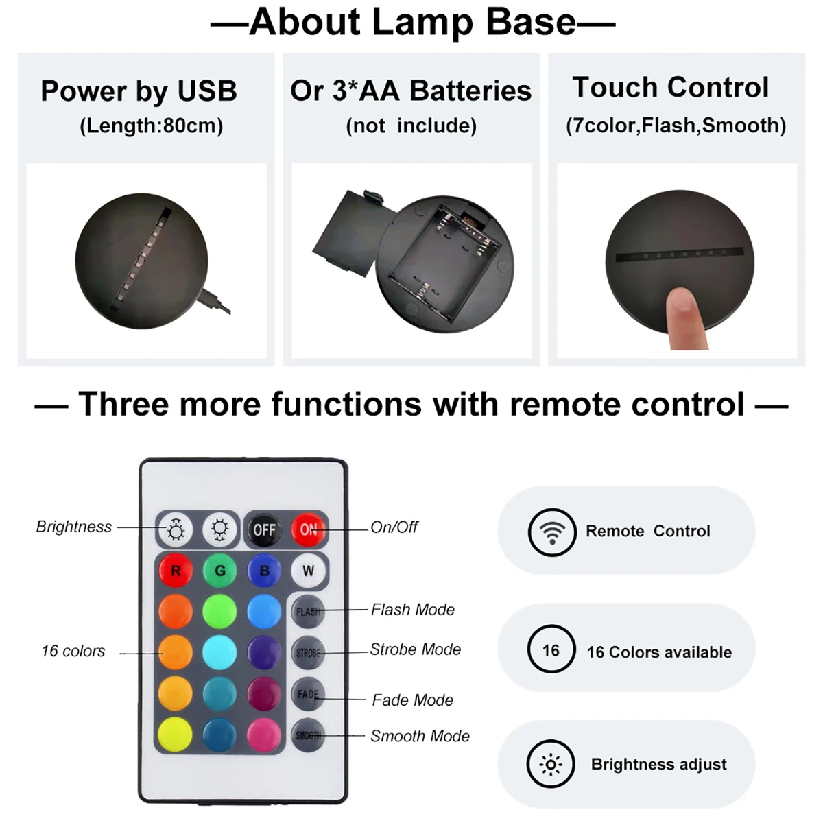 Основные характеристики: 7 сменных цветов: красный, зеленый, синий, желтый, голубой, фиолетовый и белый Сенсорный режим: нажмите сенсорную кнопку один раз, чтобы изменить один цвет, если нажать 8-й раз, цвета будут изменены автоматически. Удерживайте выключатель в течение 2 секунд, чтобы выключить. Режим дистанционного управления: пульт с включением/выключением, 16 цветов, регулируемая яркость, режим вспышки, плавный режим. Посылка оптическая акриловая панель, размер в 200*150*4 мм Лампа ABS основание, размер: 0,85*40 мм пульт дистанционного управления кабель Micro USB использование r ручное низкое потребление, не будет жарко после долгой работы, источник светильник использует светодиодный светильник мягкий и равномерный, не ослепляет, не мерцает, не повредит глаза. Параметр светильник вая панель материал: оптический акрил Расход энергии: 0,012квт. Ч/24 часа срок службы светодиодный: 10000 часов Мощность: 0,5 Вт Напряжение: 5 В Цвет света: красный, зеленый, синий, желтый, голубой, фиолетовый, белый (можно зафиксировать один цвет или 7 цветов постепенное изменение) Потребление: 3 Вт Источник питания: При подключении USB интерфейса или с использованием батареек 3 * АА (не входят в комплект) Размер посылка: 22 см * 16 см * 6 см реальная вещь намного лучше, чем на фотографиях!