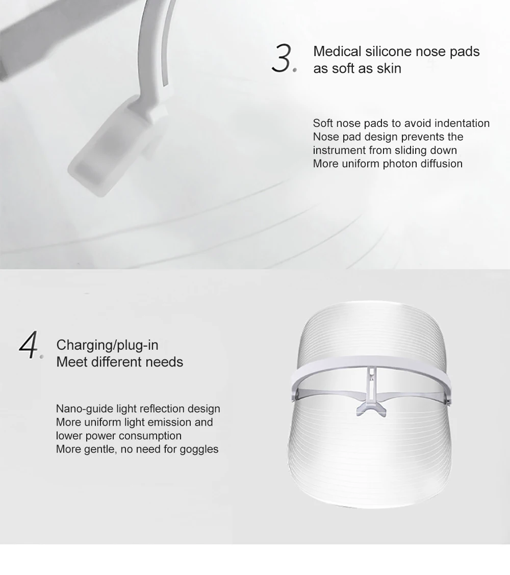 Красный (620nm-750nm), чтобы повысить жизненную силу. Синий (475nm-495nm) для восстановления кожи. Желтый (590nm-620nm), гладкая и нежная кожа, повышает эластичность кожи и повышает упругость кожи.