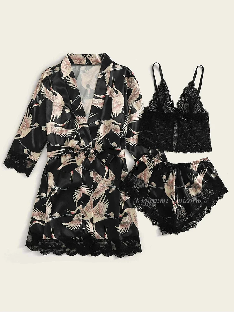 Пижамный комплект Женский атласный из 3 предметов, халатик из искусственного шелка с цветочным принтом, кружевная Пижама с V-образным вырезом, домашняя ночная рубашка, на лето