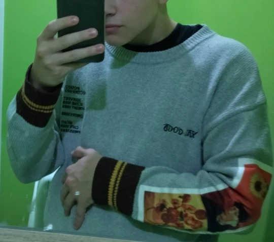 это невероятно. посылка пришла в срок, в последний день (до мск). Когда открываешь посылку - в нос бьëт самый настоящий запах русской бабушки, и сам свитер будто бы сделан своими руками, а принт на рукаве (нашивка) - это во всех смыслах отдельный вид искусства, он сделан из синтетической ткани, которая очень даже вписывается в этот свитер. ∞/10