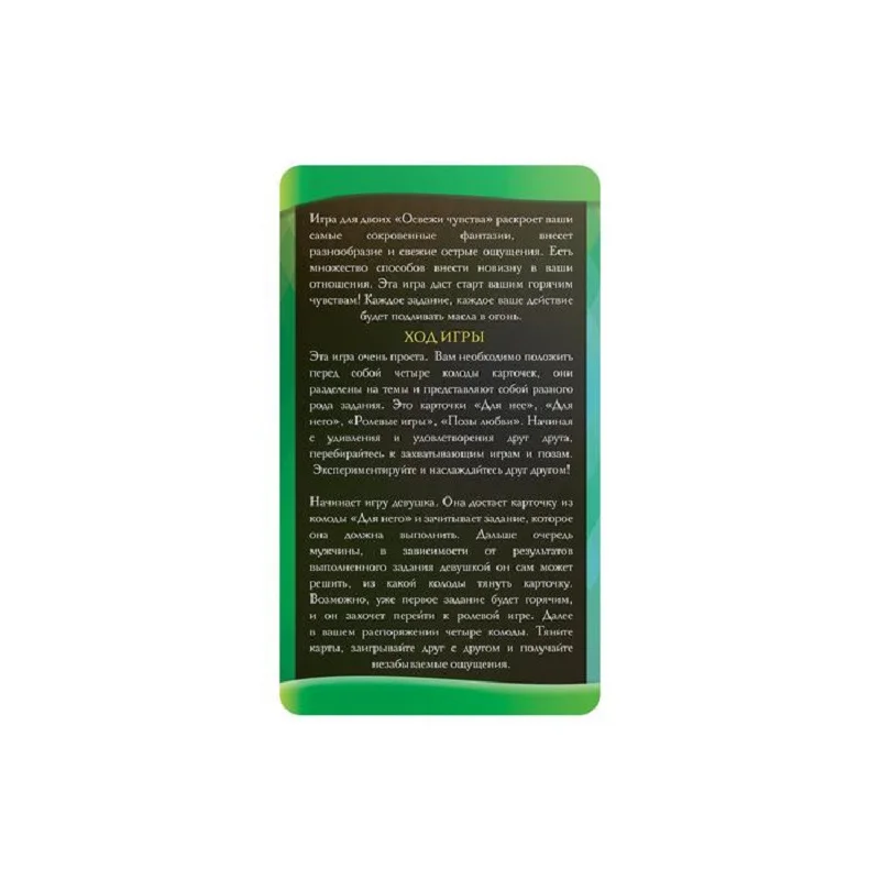 игра хорошая, мне нравится, единственное была помята одна карта с правилами пробовала играть со своим мужем, но из-за его нехотения и мыслей что игра не очень, игра получилась не очень страстной и хорошей, так как он почти не выполнял задания так как нужно и без особого инузиазма