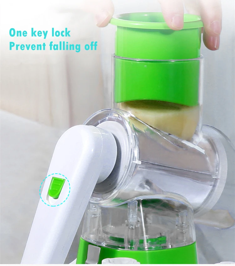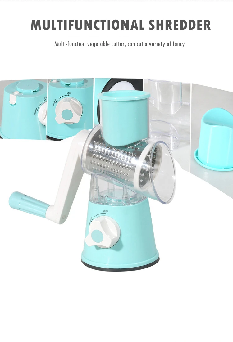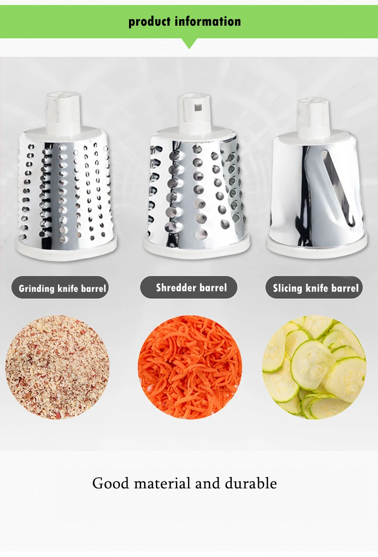 Инновационная конструкция барабана, нарезка овощей не травмирует руки. Посудомоечная машина безопасна, водонепроницаема и легко моется. Профессиональное качество нарезки можно быстро и легко создать с 3-лезвием измельчителя. Существует три различных барабана для резки нитей, толстых нитей и листов и тонера. Нескользящая конструкция. Вы можете нарезать овощи, вращая ручку. После использования просто краску мобильным краном.