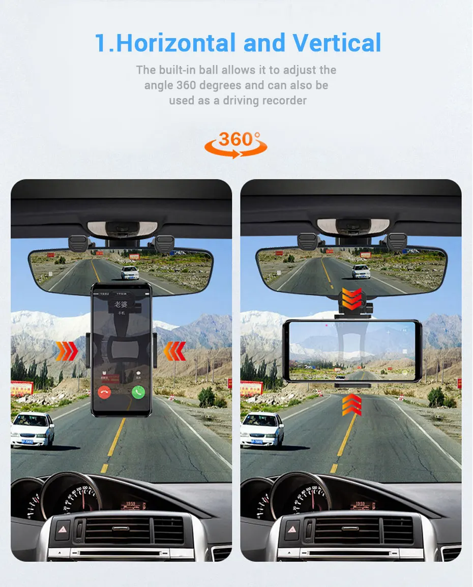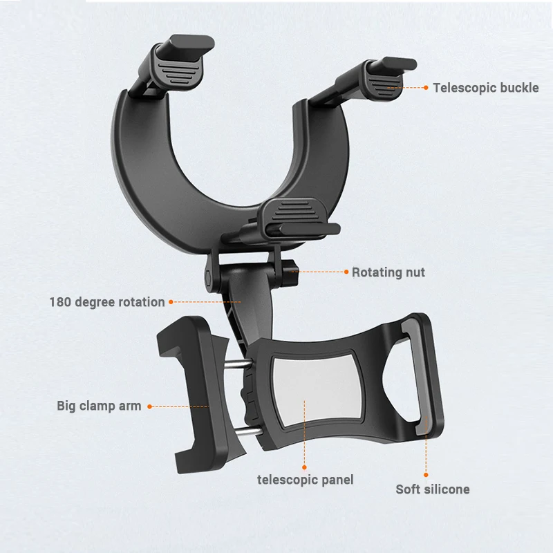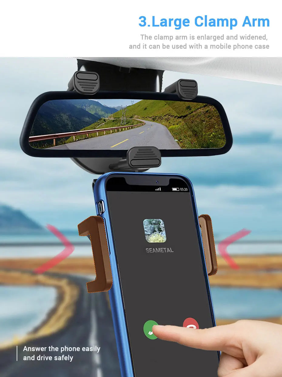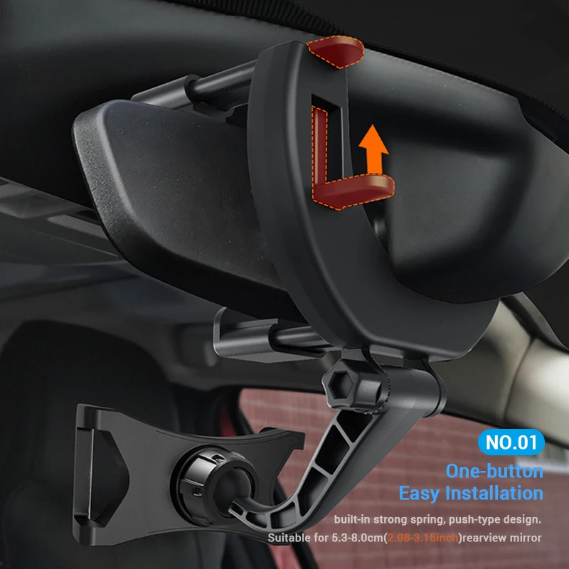 3. [простота в эксплуатации] Автомобильный держатель телефона оснащен рычагом автоматической регулировки, который прост в установке. Телескопический зажим расположен в зеркале заднего вида над сидением водителя в автомобиле, который может быть легко установлен и полностью зафиксирован без падения;