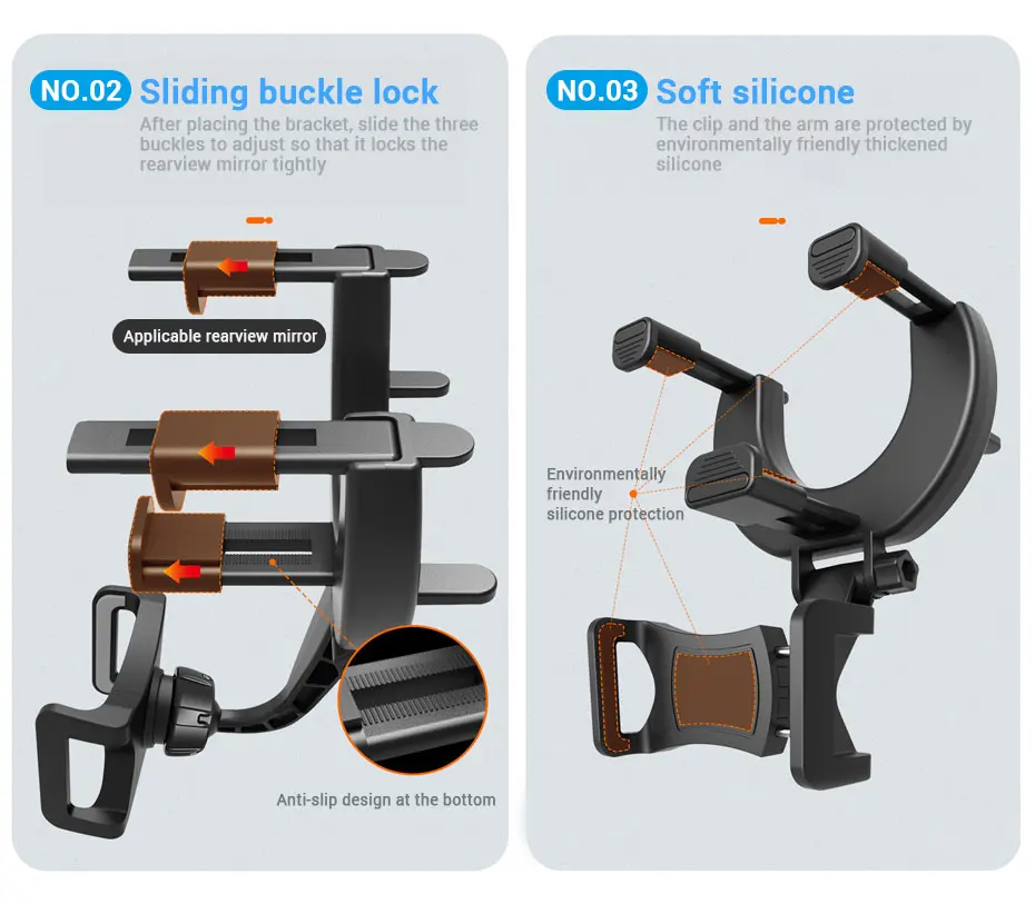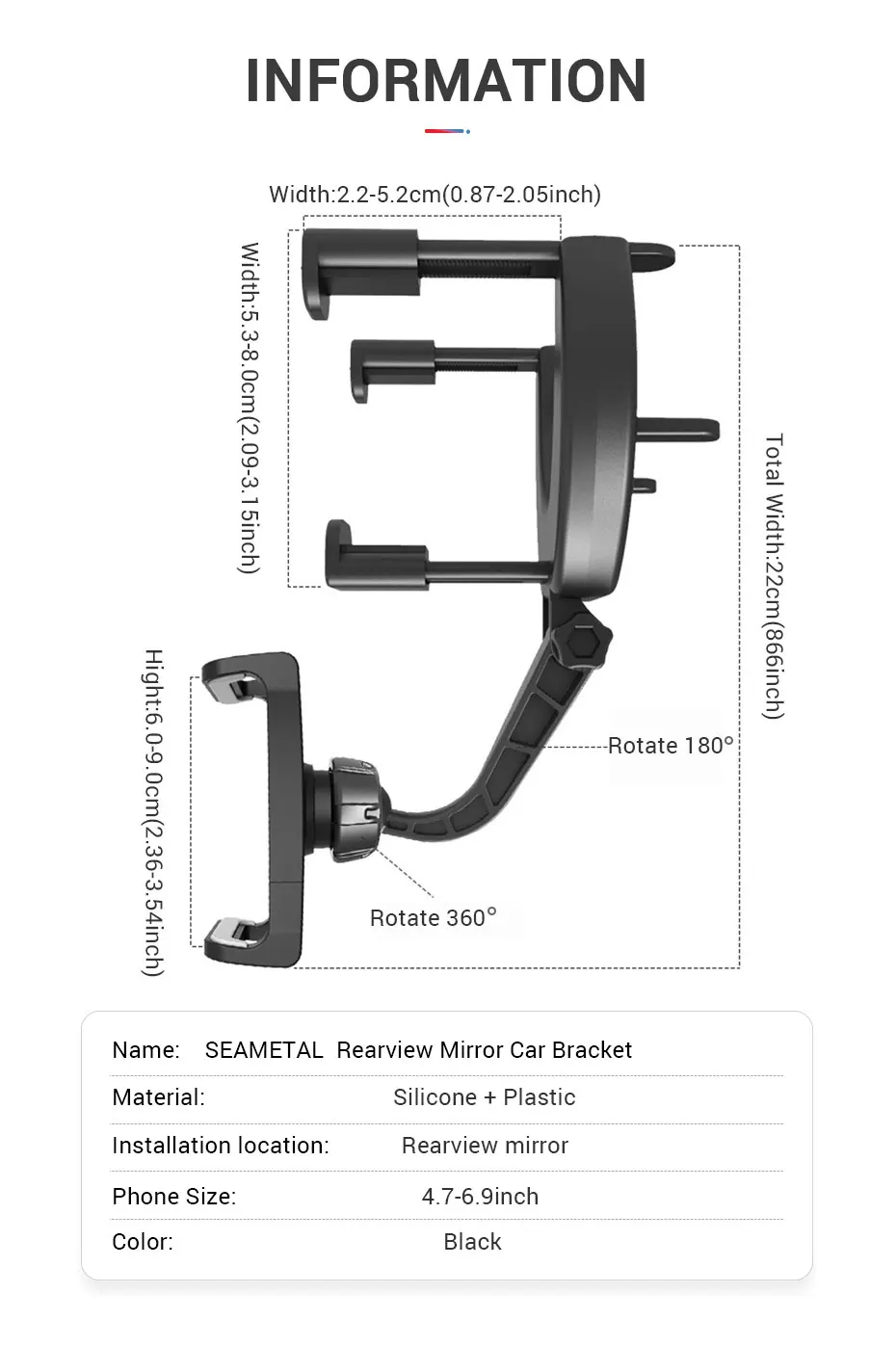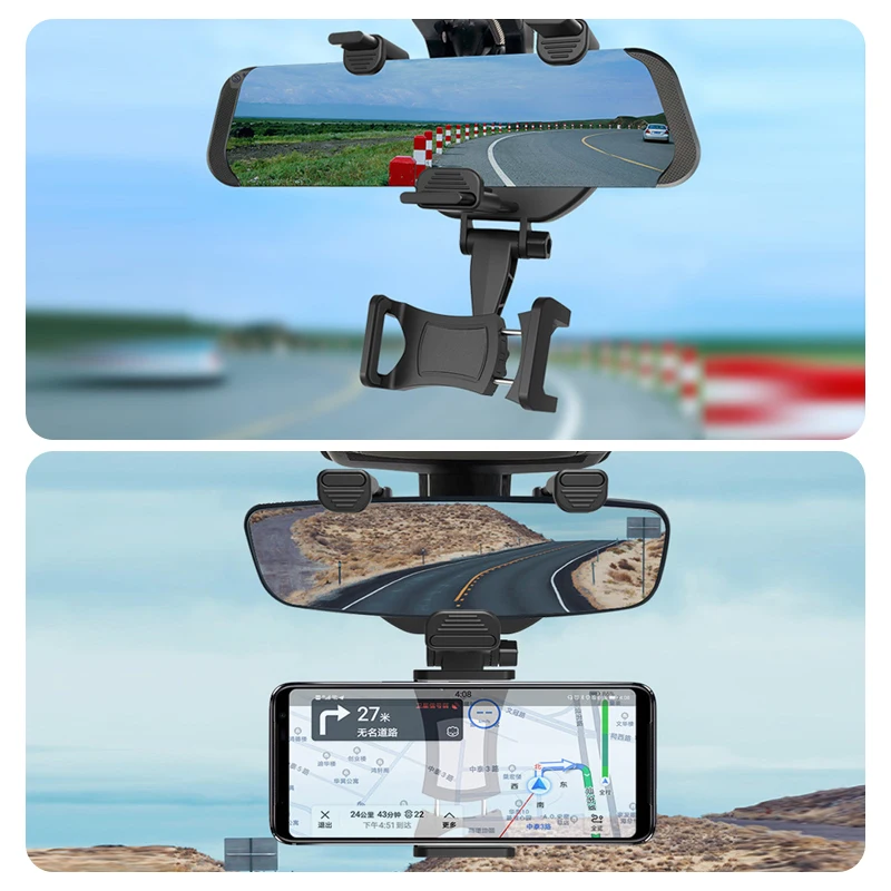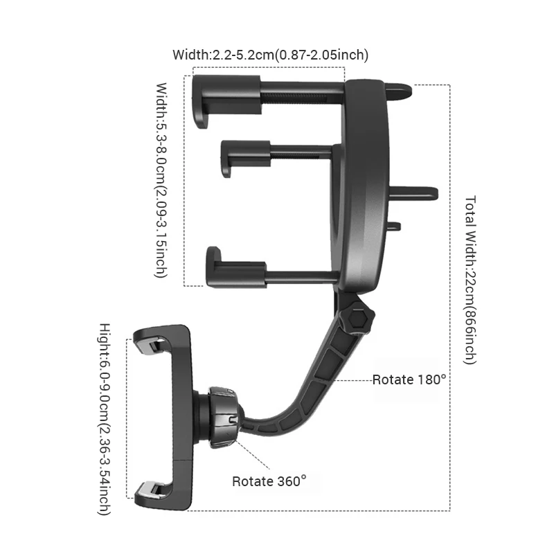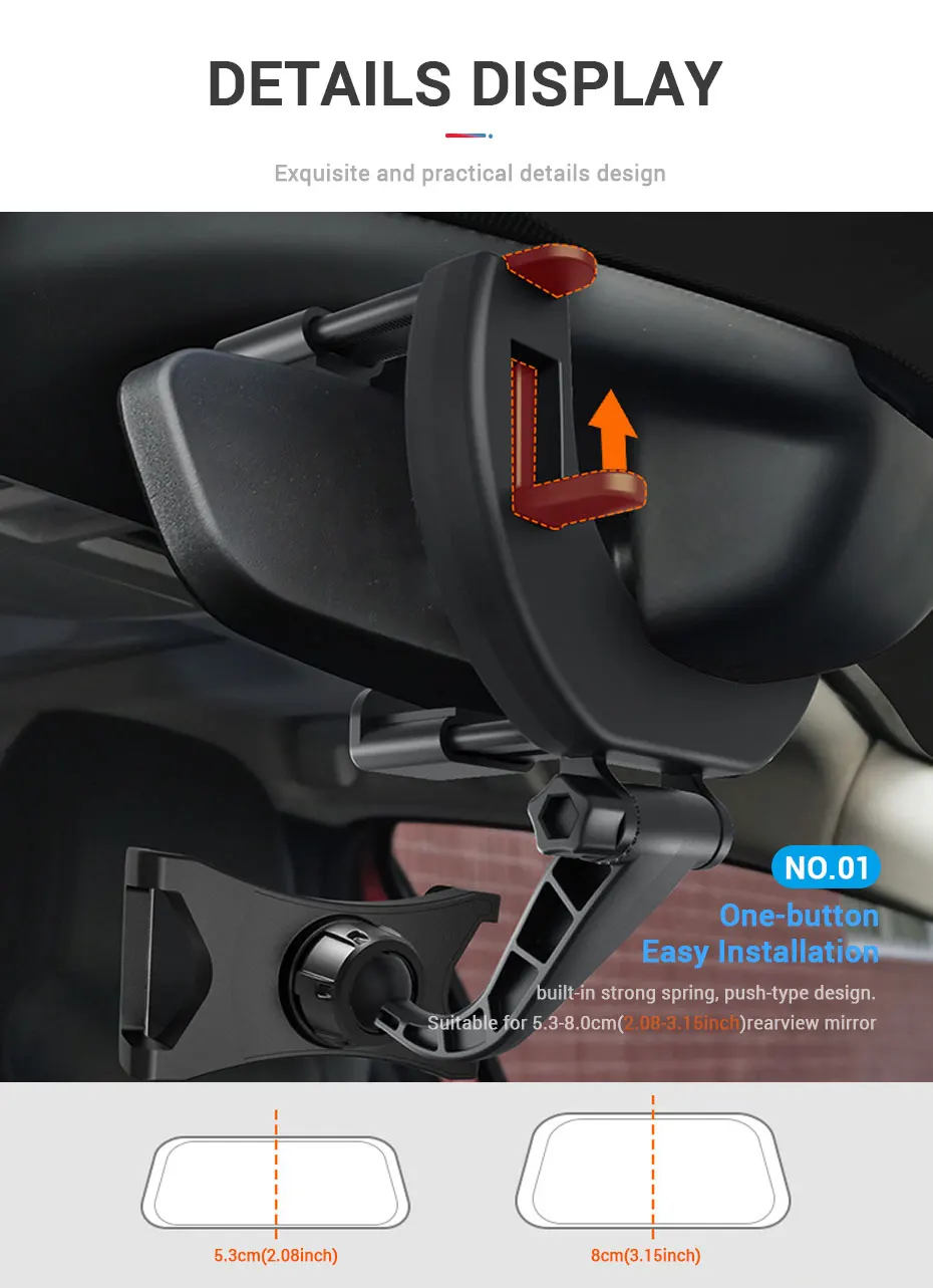 3. [простота в эксплуатации] Автомобильный держатель телефона оснащен рычагом автоматической регулировки, который прост в установке. Телескопический зажим расположен в зеркале заднего вида над сидением водителя в автомобиле, который может быть легко установлен и полностью зафиксирован без падения;