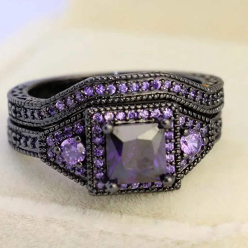 Оптовая продажа, модные ювелирные украшения, комплект свадебных колец с фиолетовым цирконием и черным заполненным камнем в стиле принцессы на годовщину