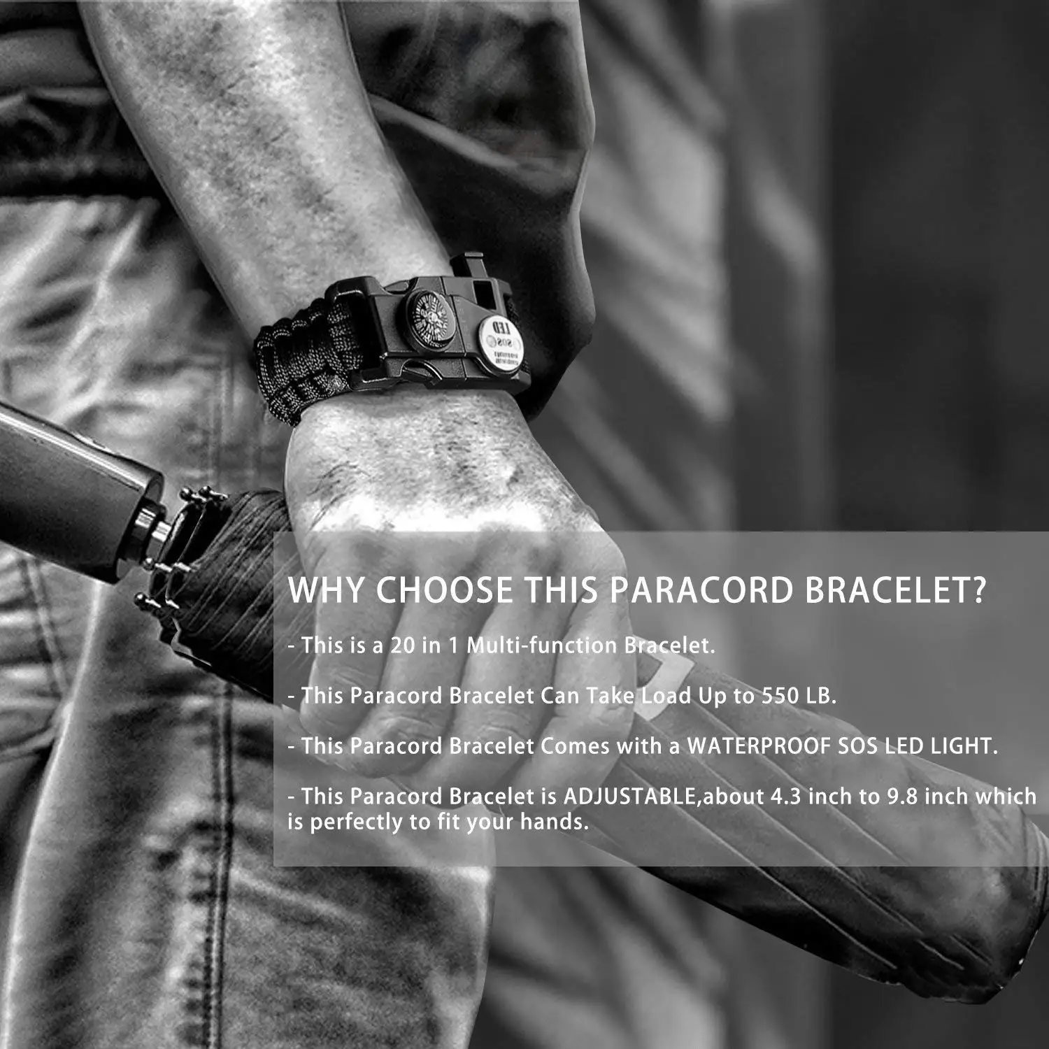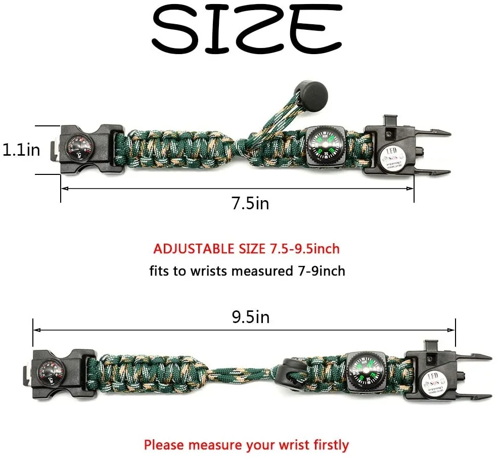 Этот регулируемый браслет для выживания составляет около 7,5 дюймов до 9,5 дюймов, который идеально подходит для вашего запястья. Переключение ремешок позволяет вам подстраиваются под запястье или прикрепить ее к вашей сумке, ремень или рюкзак. Также вы можете купить его для друзей в качестве подарка для каякинга, пеших прогулок и катания на лошадях друзей.