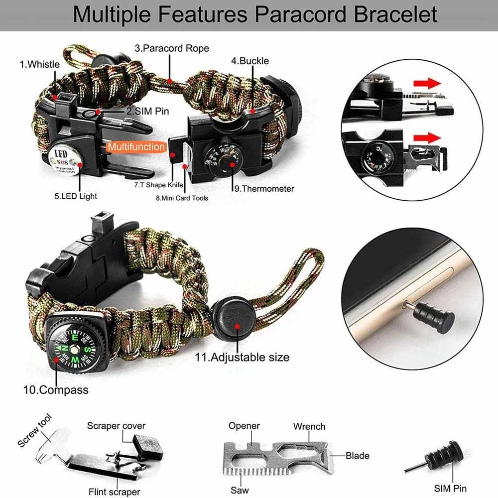 3,2 метр парашютный шнур с 7 core-113 кг сила Паракорд multiltool браслет может быть разматывается, чтобы быть использованы для выживания ситуациях, таких как: защита палатки, гамаки, тяжелые предметы и т. д. Термометр идеально подходит для быстрого определения температуры в реальном времени (по Цельсию)