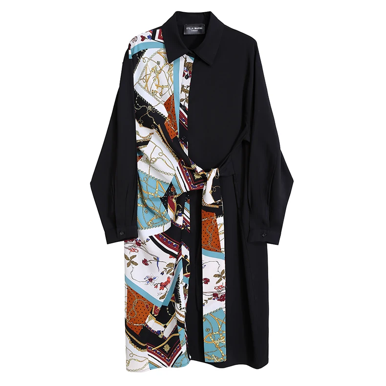 Новинка, женское летнее платье с длинным рукавом, большие размеры, черное платье-рубашка с принтом и поясом, прямое женское платье миди, стильное платье для вечеринки