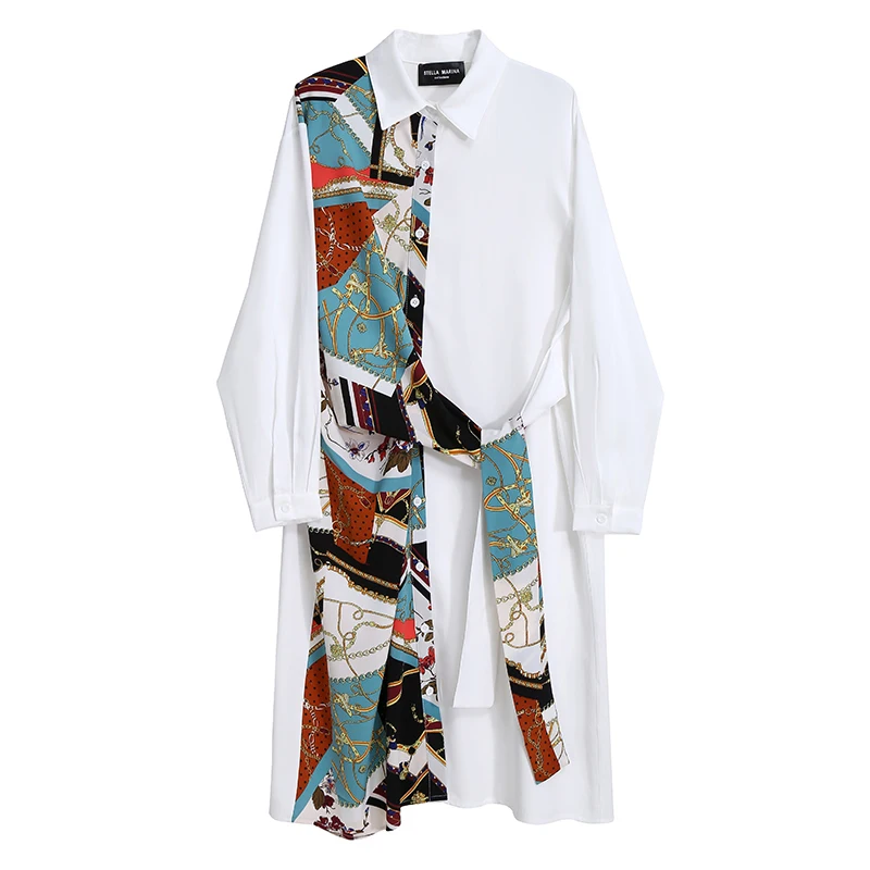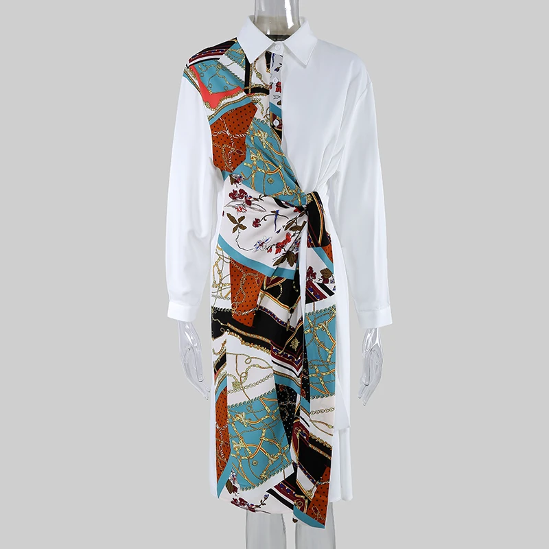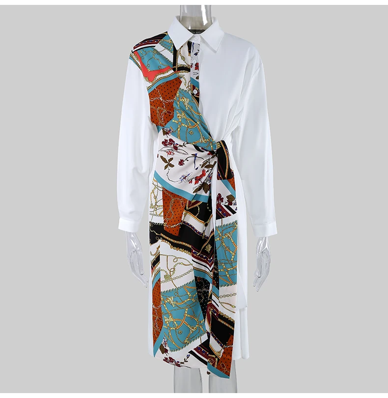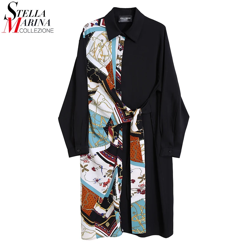 Новое Женское летнее платье-рубашка с длинным рукавом размера плюс, черное платье-рубашка с принтом и поясом, прямые миди женские стильные вечерние платья Femme 8006