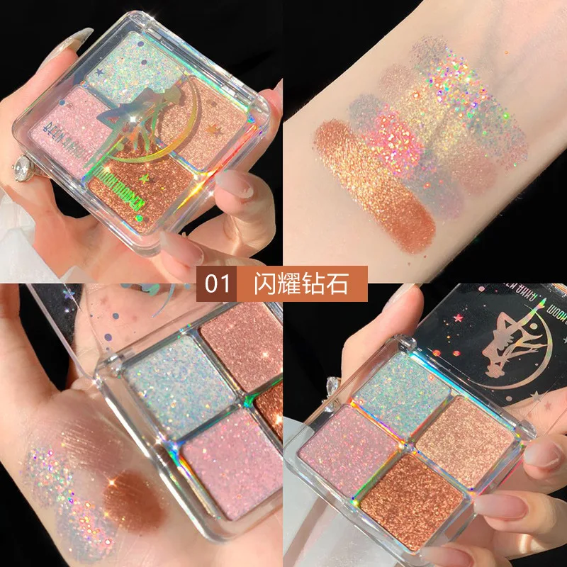 Палитра теней для век с блестками, 4 цвета, перламутровые алмазные яркие блестки, водостойкие дымчатые тени для макияжа, косметика